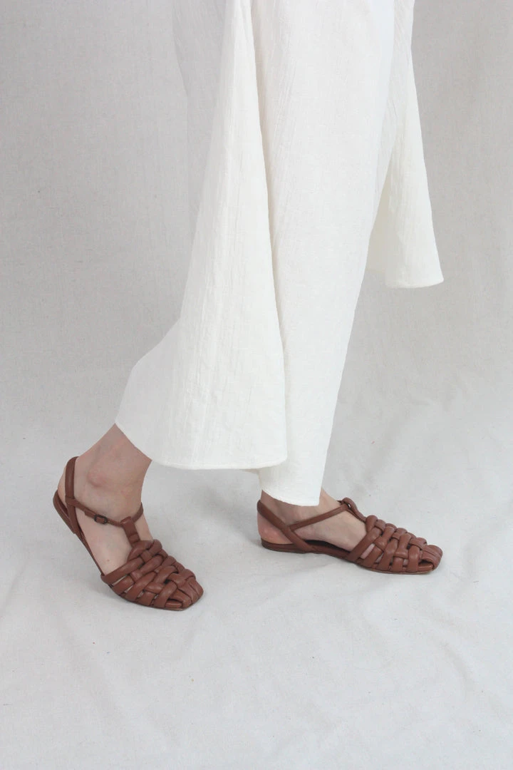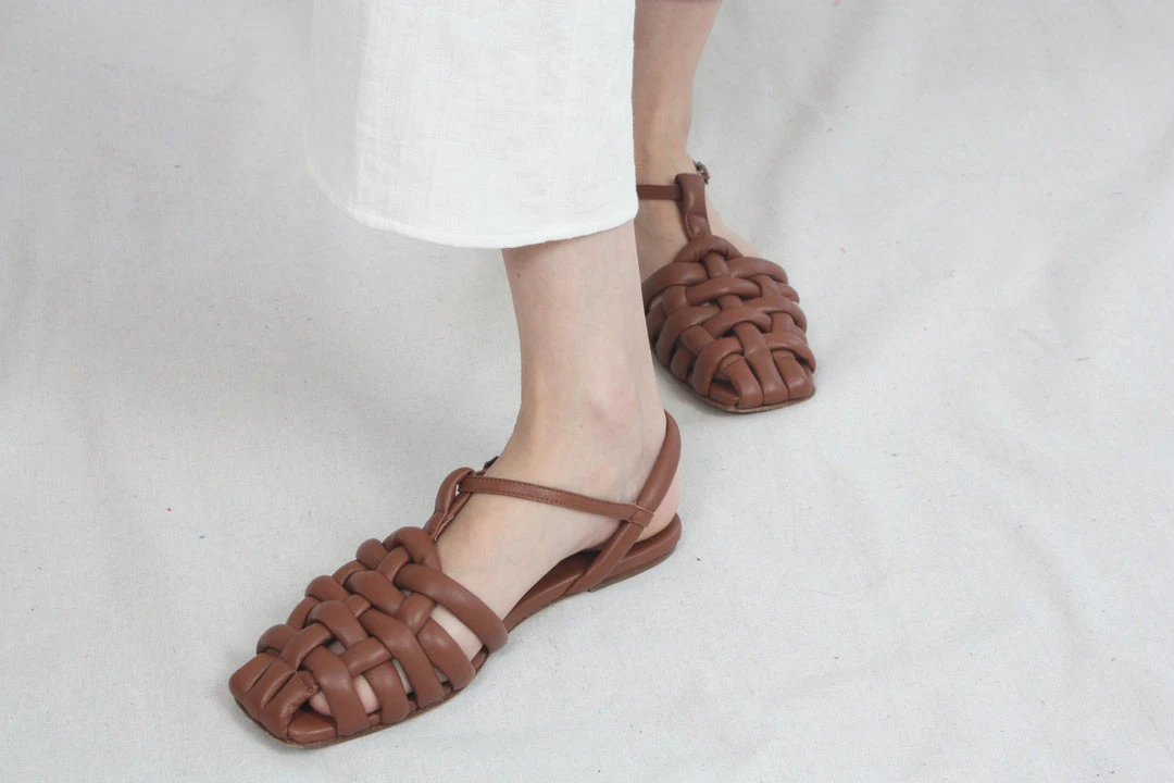 Square toe padded flat fisherman sandal crafted in soft lambskin. Cushioned Leather footbed.