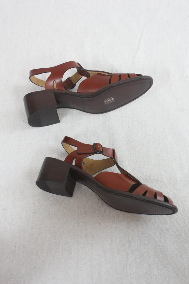Heeled t-bar sandal crafted in Spanish full-grain leather. Leather outsole with stacked leather heel. Adjustable buckle fastening.
