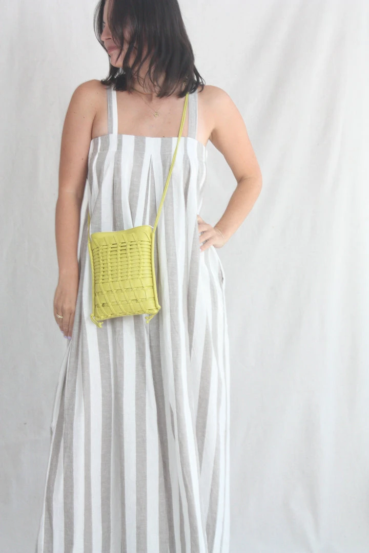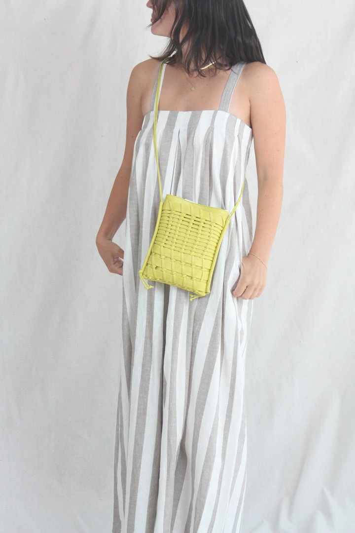 Flat square crossbody bag crafted in soft calf leather, with handwoven front pocket. Adjustable strap and magnetic closureÂ