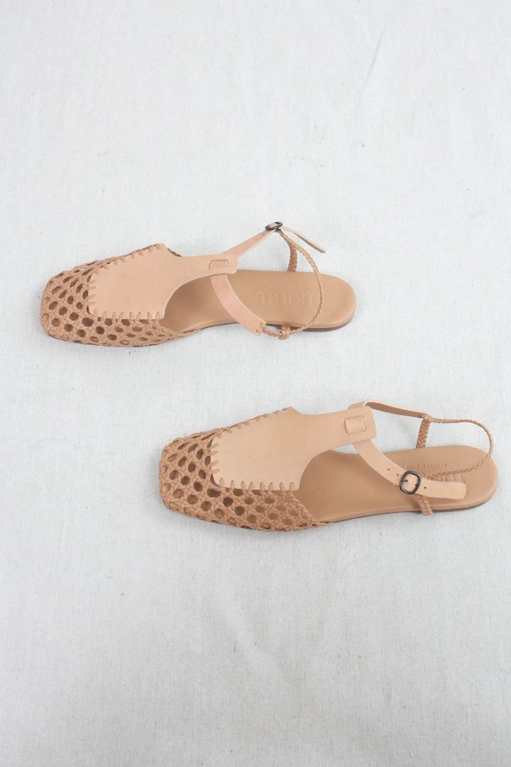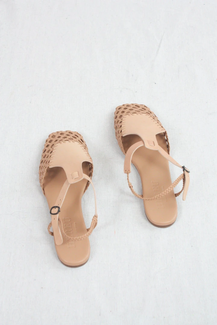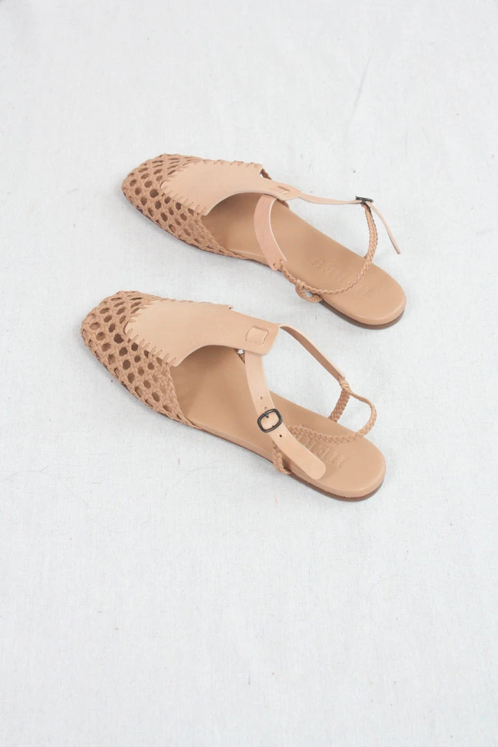 Square toe hand-woven t-bar sandal crafted in a combination of veg-tanned calf leather and supple lambskin. Adjustable buckle fastening. Cushioned leather footbed.