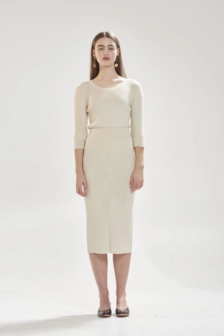 Fitted, ribbed knit pencil skirt with elastic waistband. Mid length.