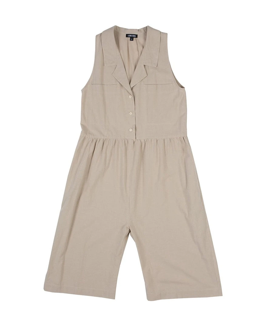 Sleeveless collared jumpsuit in a lightweight cotton slub. Button placket and gathered waist.Â