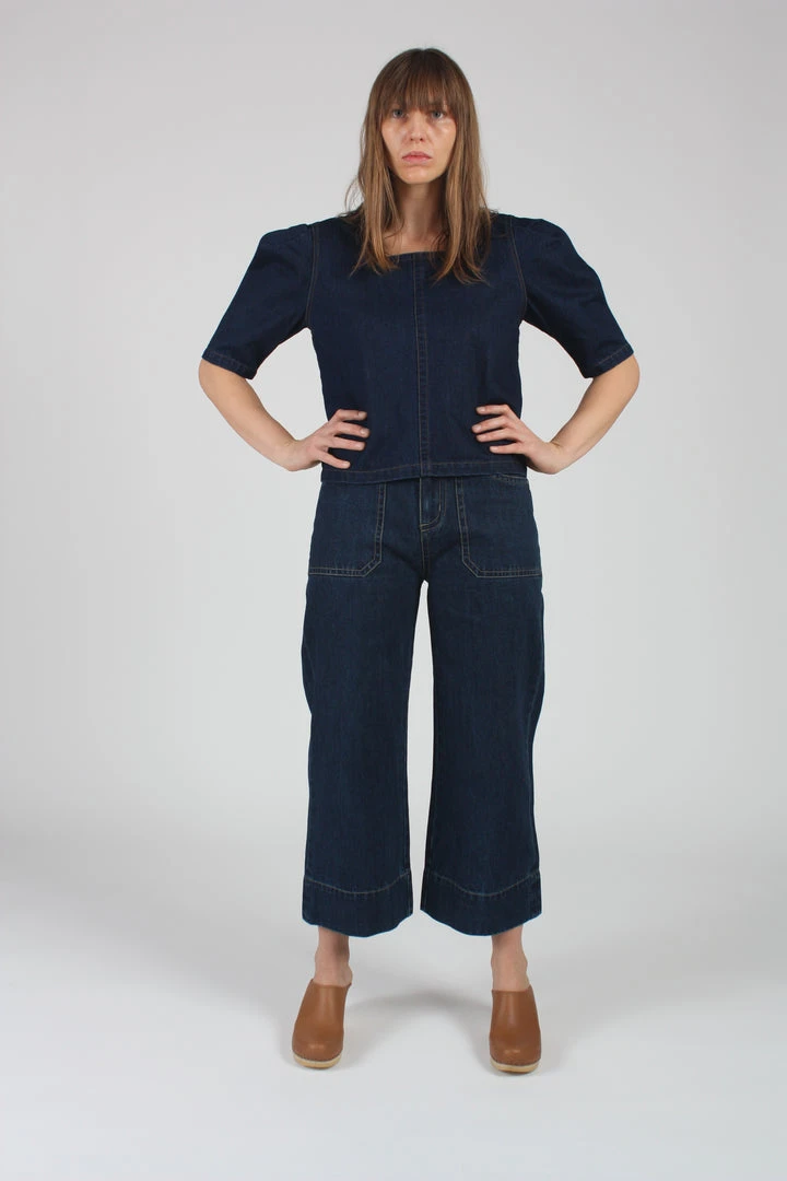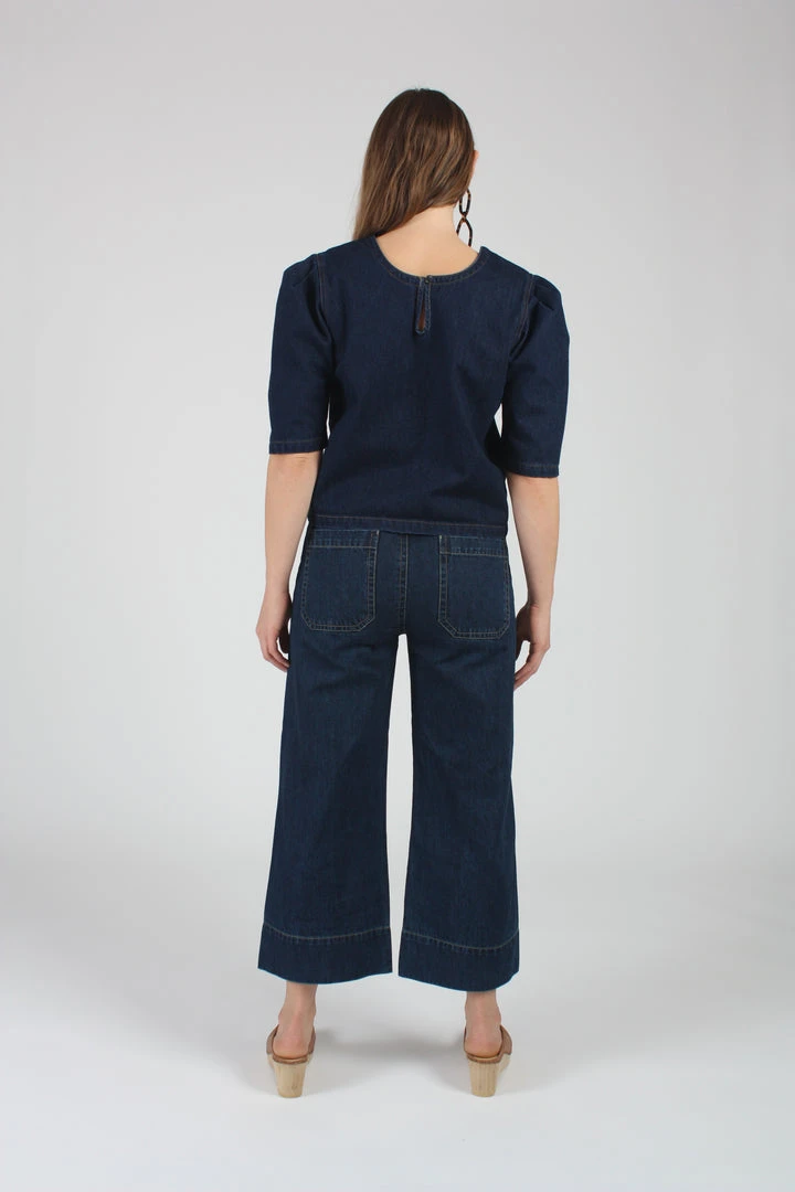 Workwear inspired timeless Carpenter Jeans in dark wash denim with contrast stitching. Work pockets at the front and back, loose leg and mid-ankle finish.