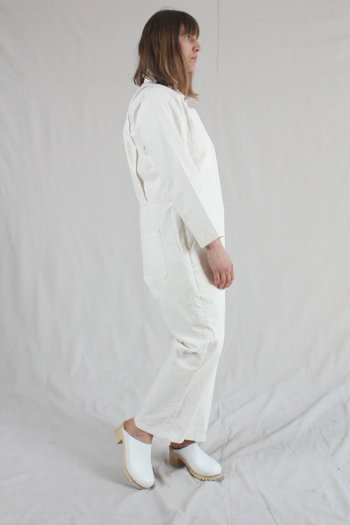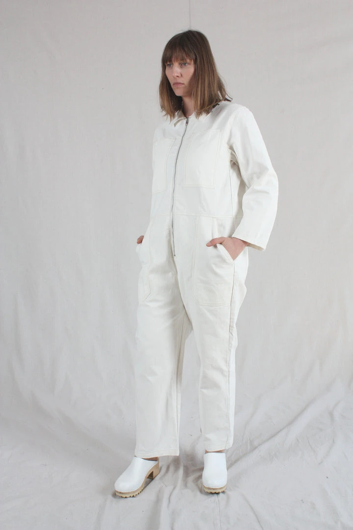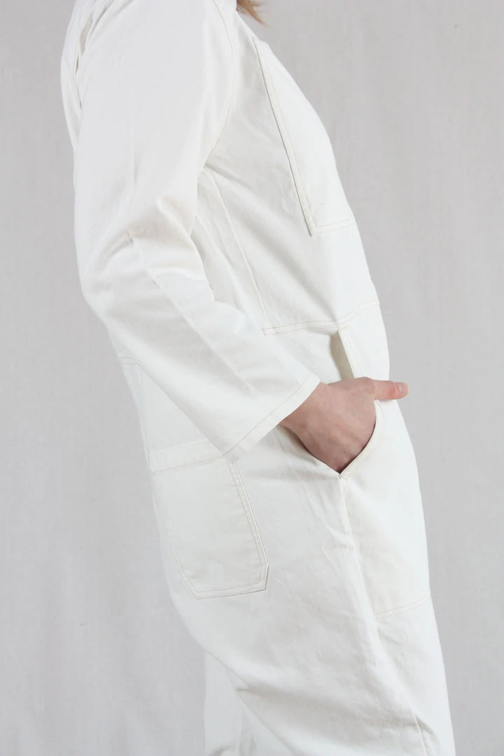 The Dominic Boilersuit has a relaxed fit and a slightly tapered leg. With 3/4 length sleeves. Large utility style pockets and contrast stitching throughout, and a silver front zip.