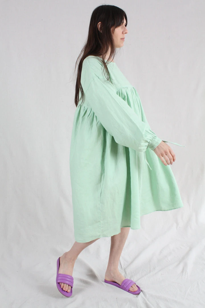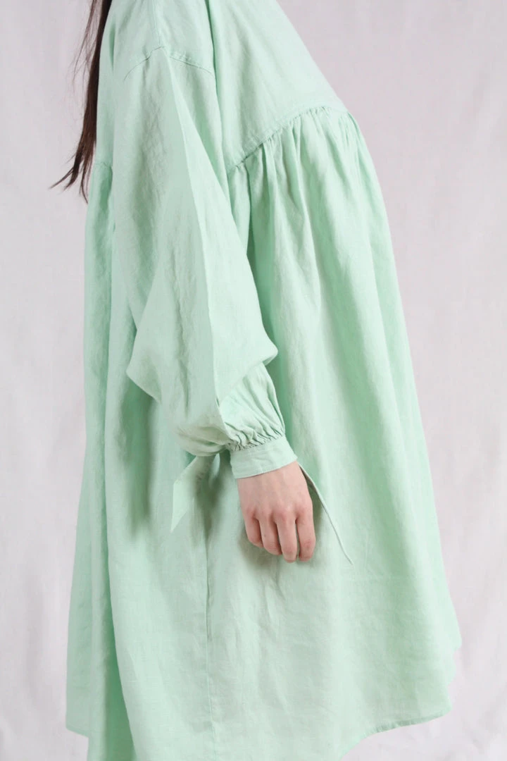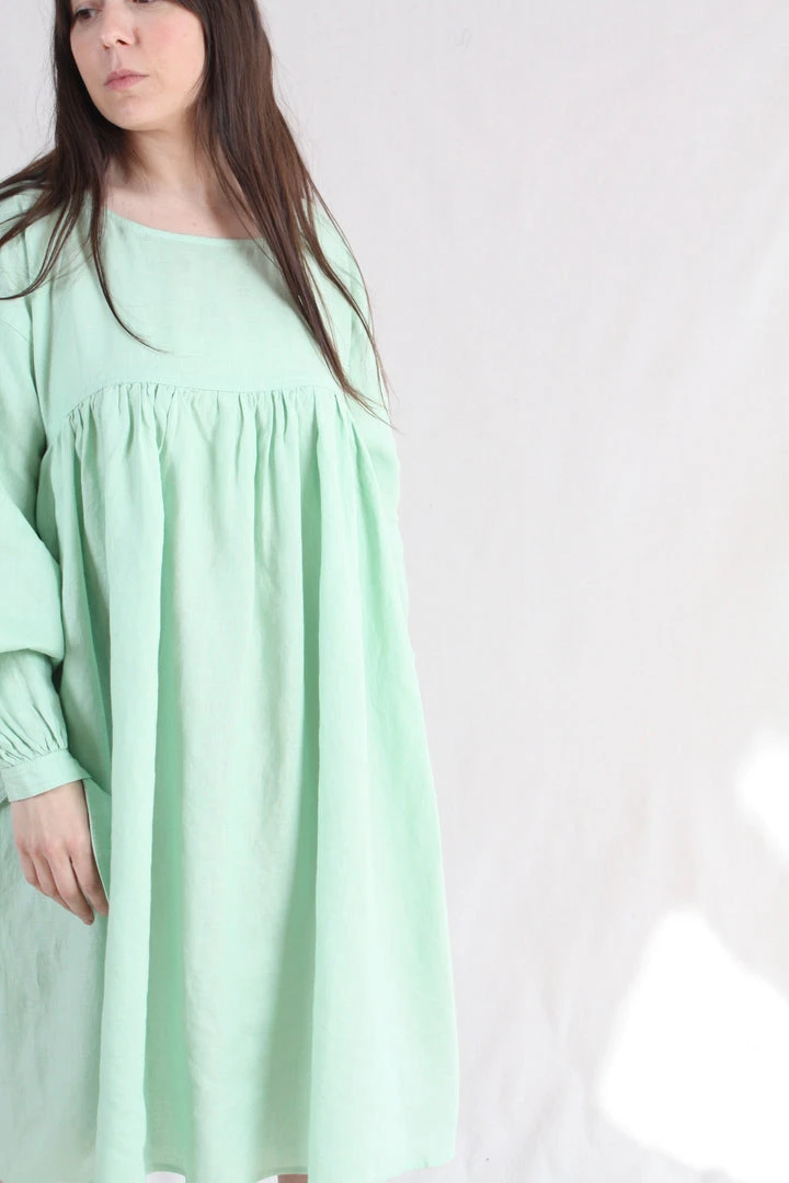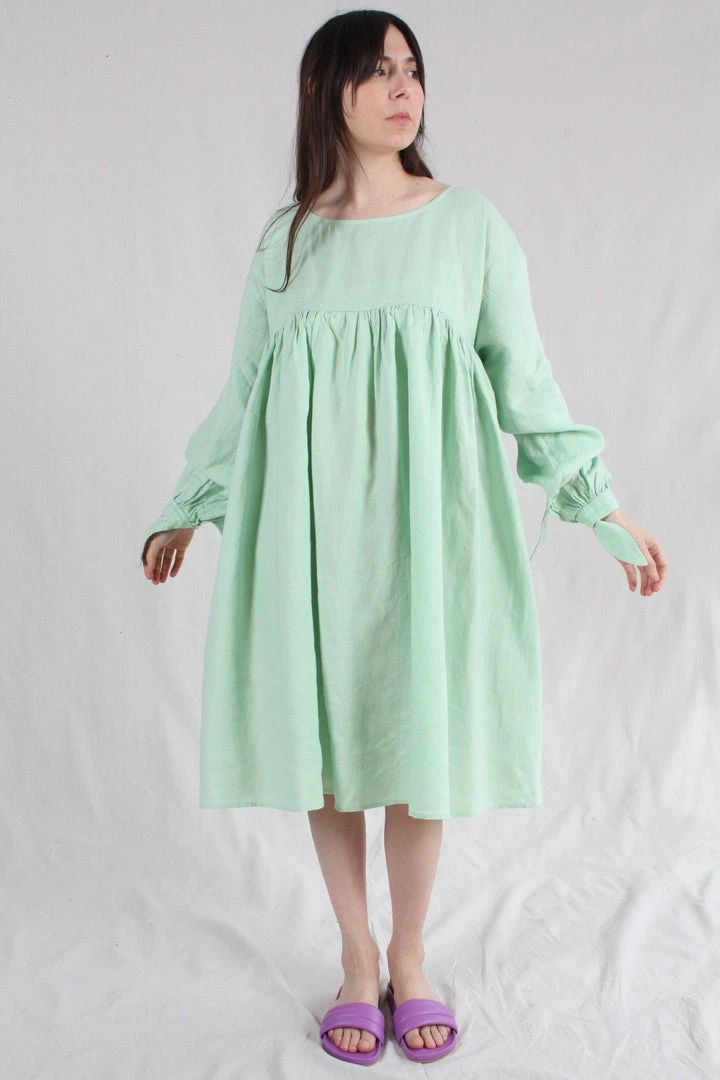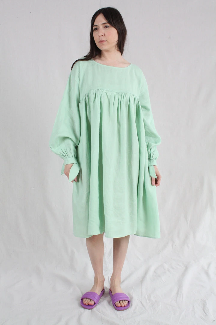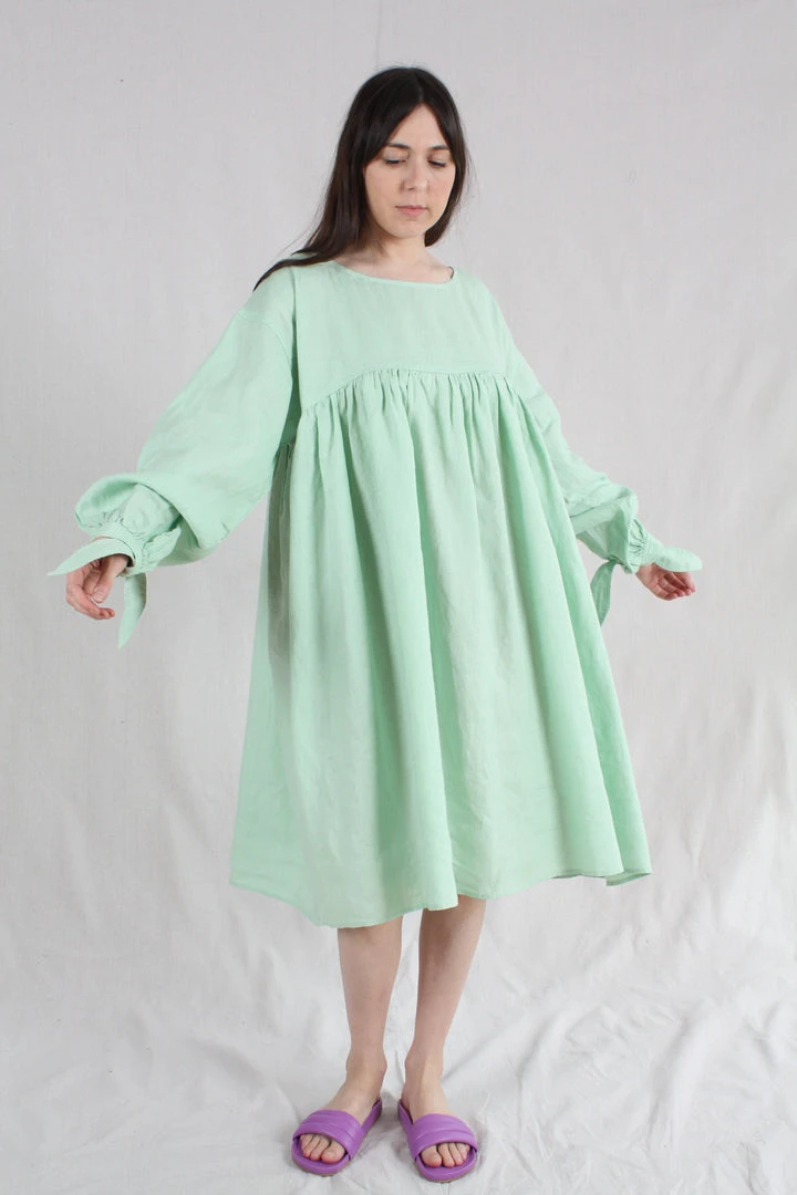Oversized knee length dress with a wide cut and a round neckline. Gathered under the bust for a flattering fit. With dropped shoulders and lantern sleeves gathered at the cuff with a knot tie. Side pockets.
