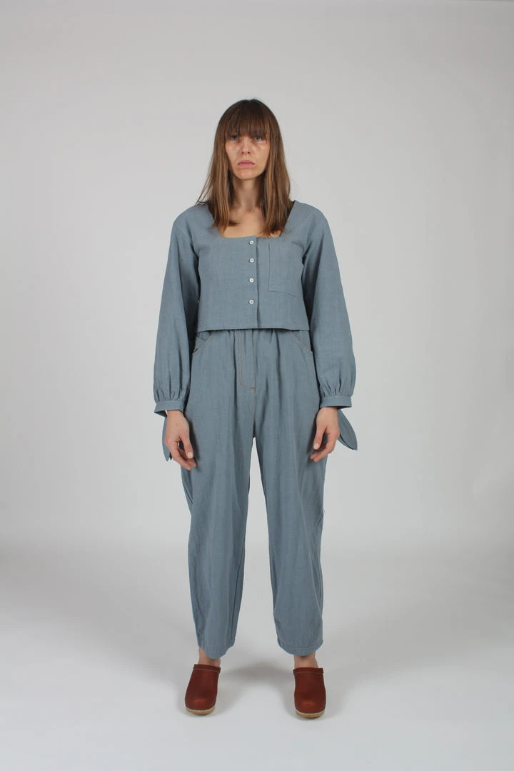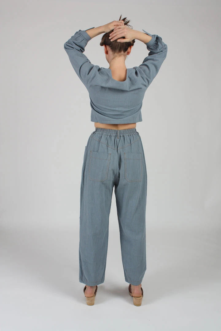 Oversized trousers in steel blue linen. Big front and back pockets. Elasticated waistline and wide legs with extra volume for added comfort.