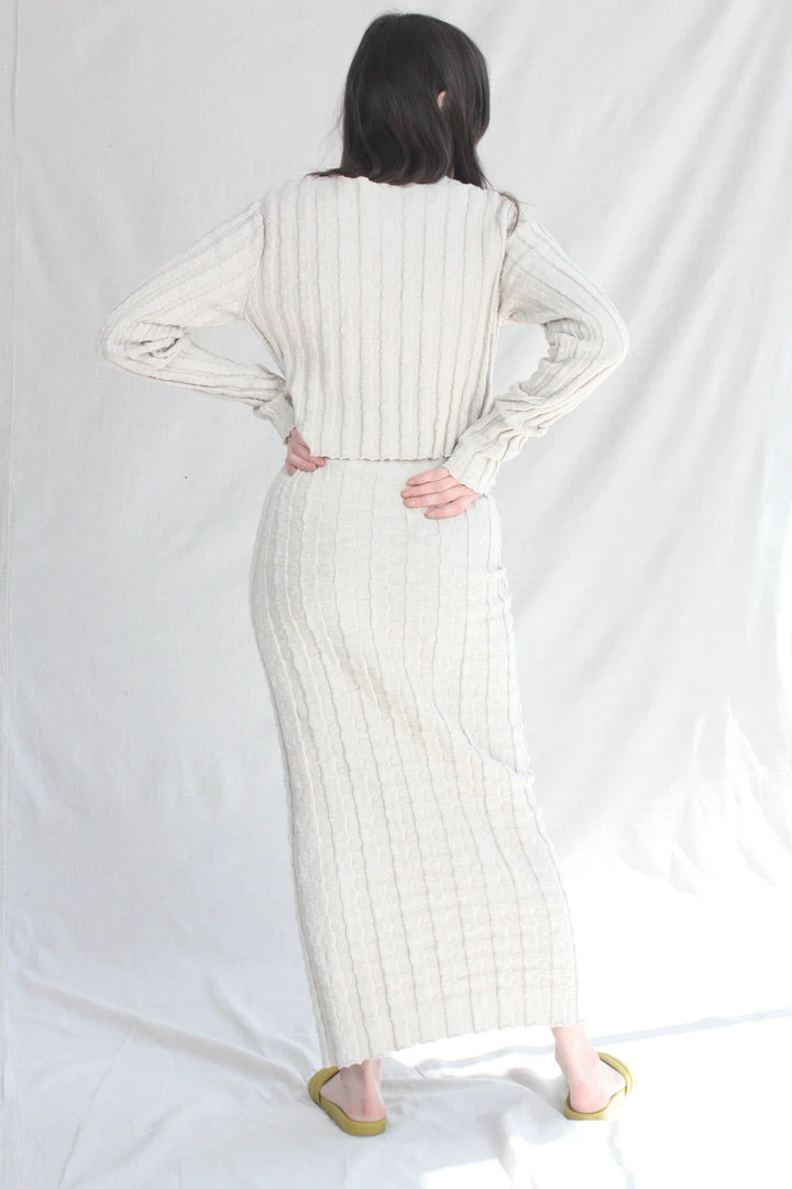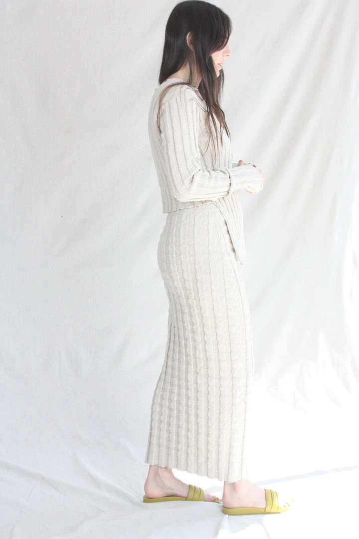 Column skirt in with an irregular slubbed texture. Puckered rib pattern with subtle stretch. Elastic waist.