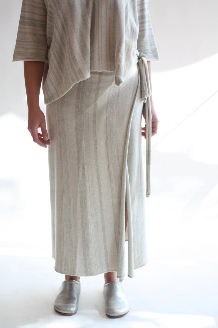 Adjustable Wrap Silhouette. Horizontally knit. Rolled edge belt.