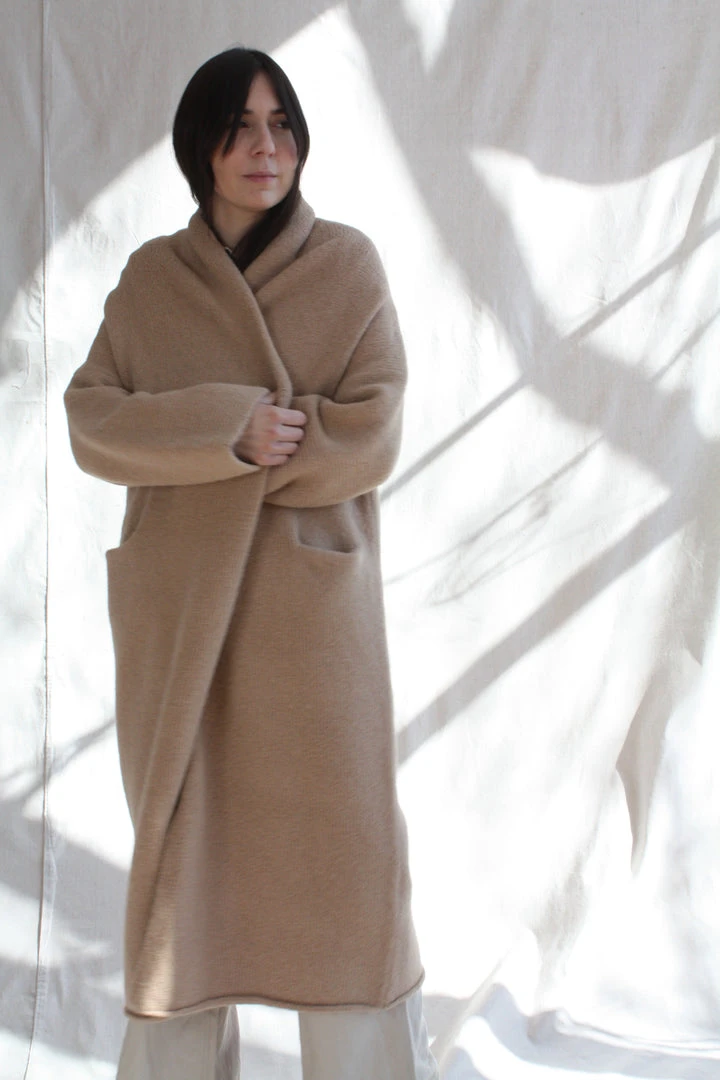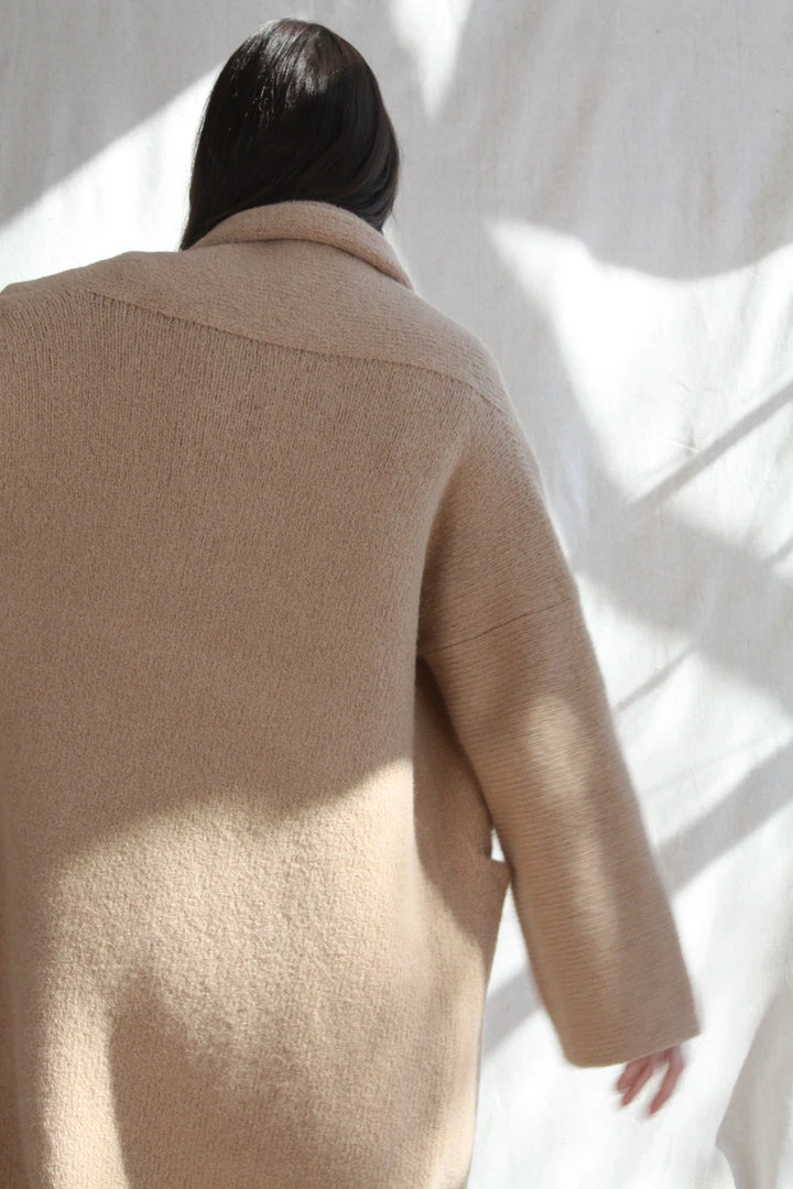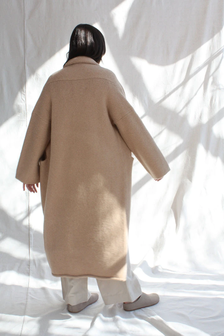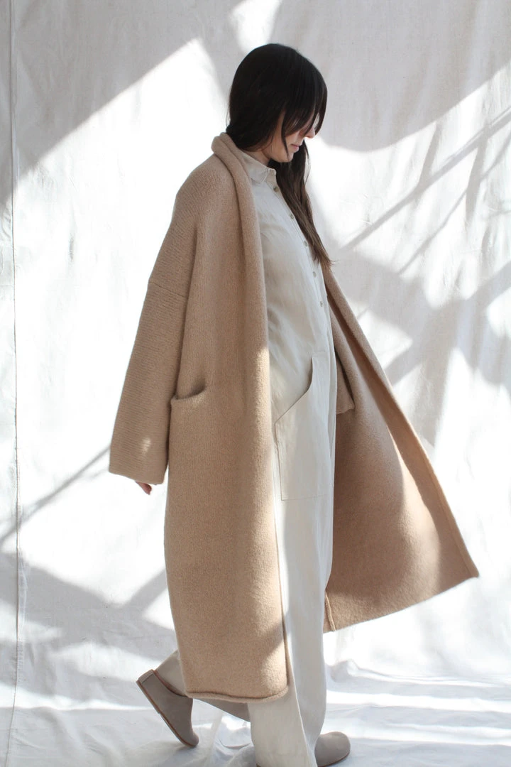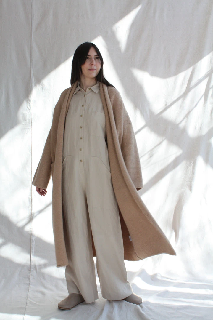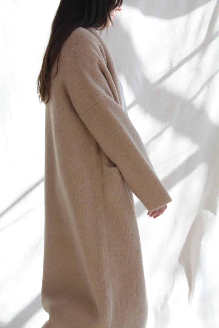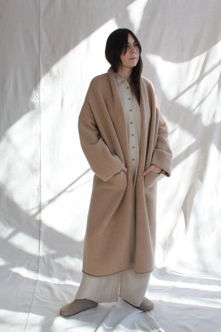 Sofy felted alpaca long cardigan. Shawl neckline with signature LM integral pockets. Undyed natural wool.