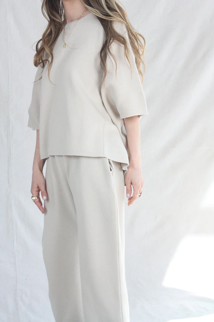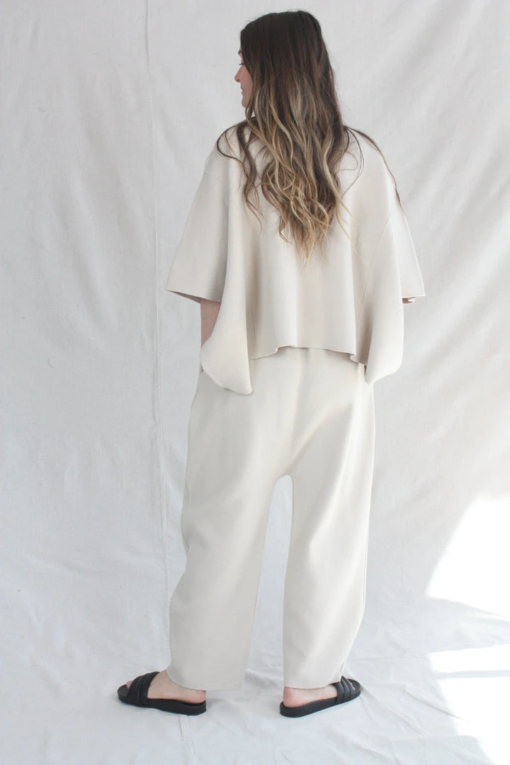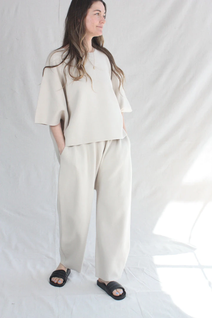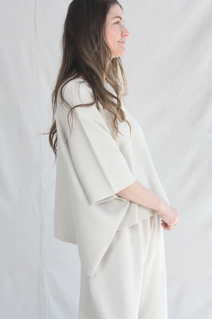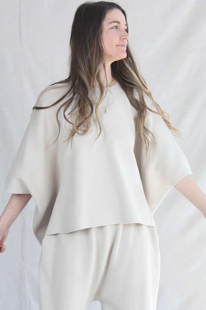 Square cut top with open armholes and a boxy, drape in a flat double knit cotton.Â