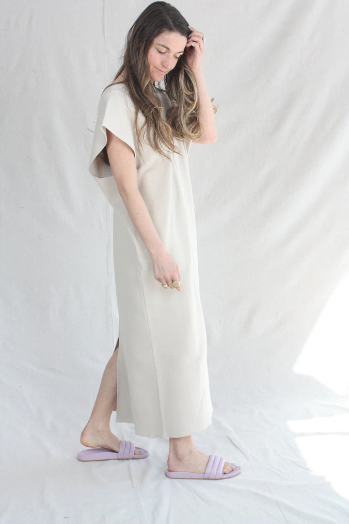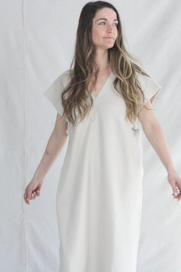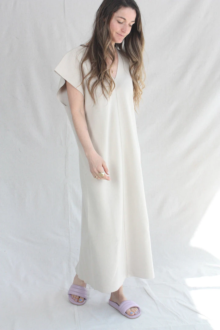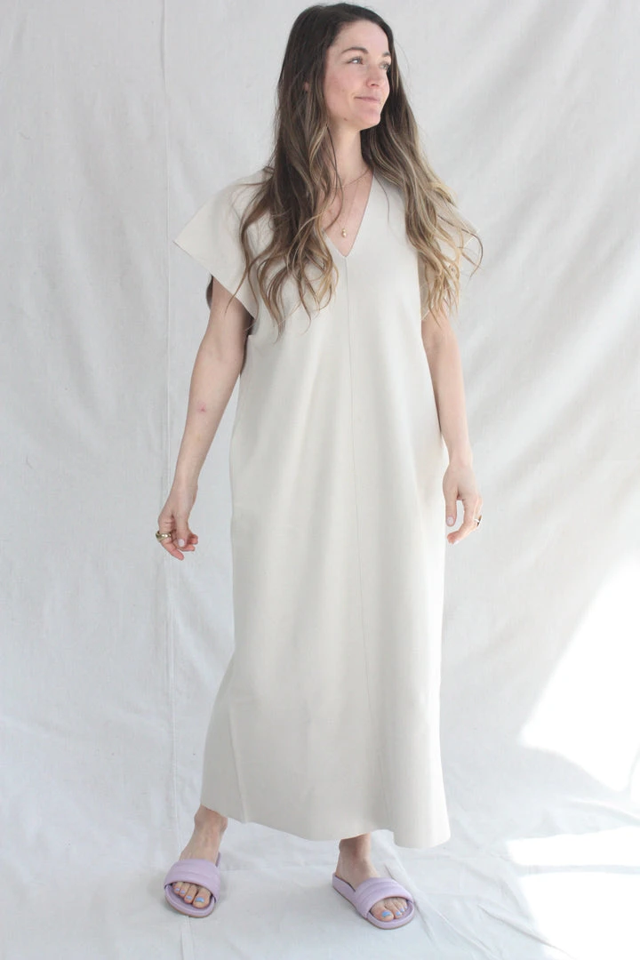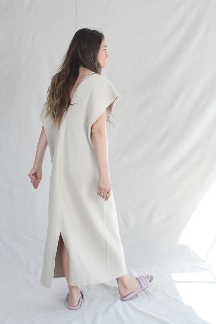 V Neck  flat double knit dress. Open armholes. Back bottom slit.Â