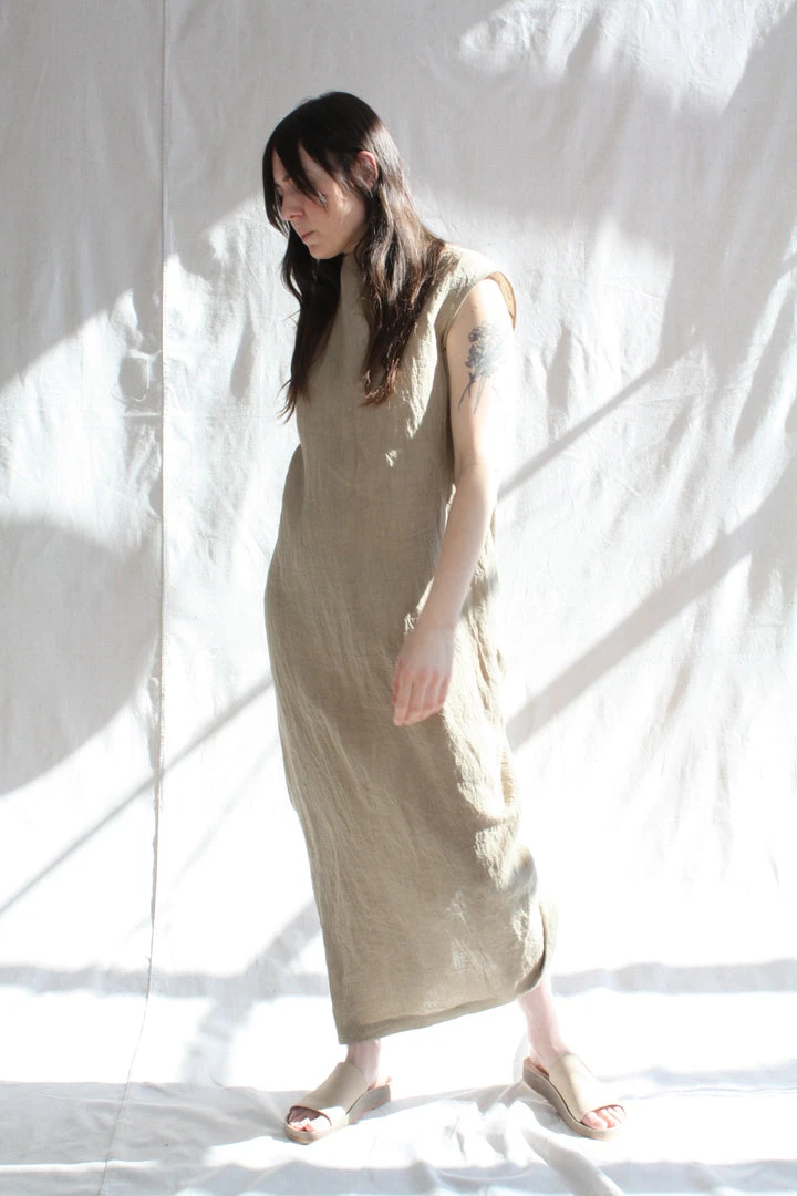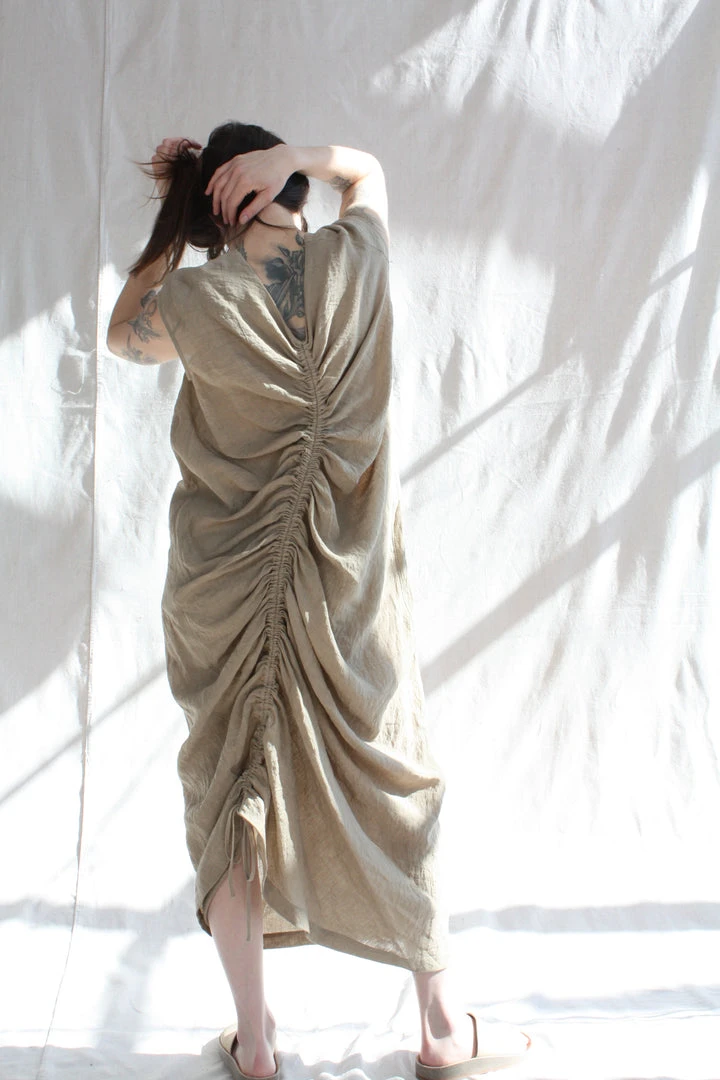 Lightweight linen ruched dress with subtle irregular dye effect. Adjustable ruching, for a customizable fit. Reversible.