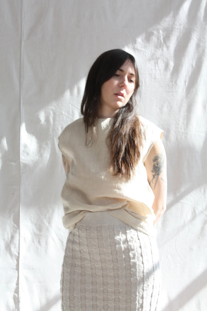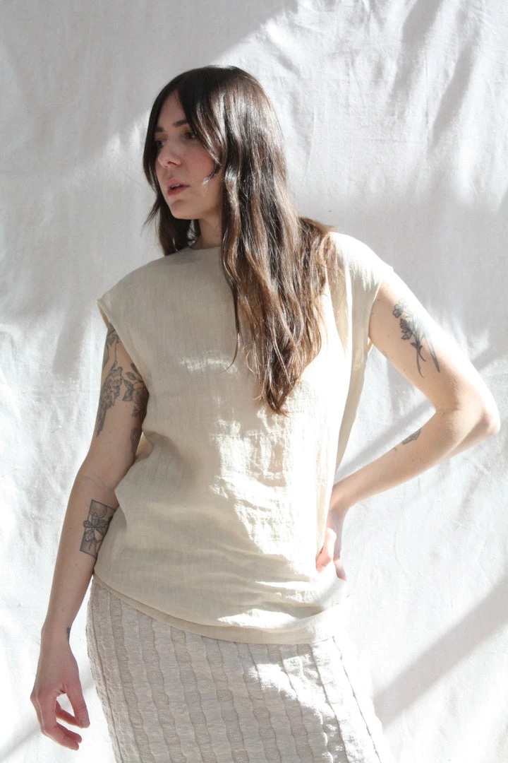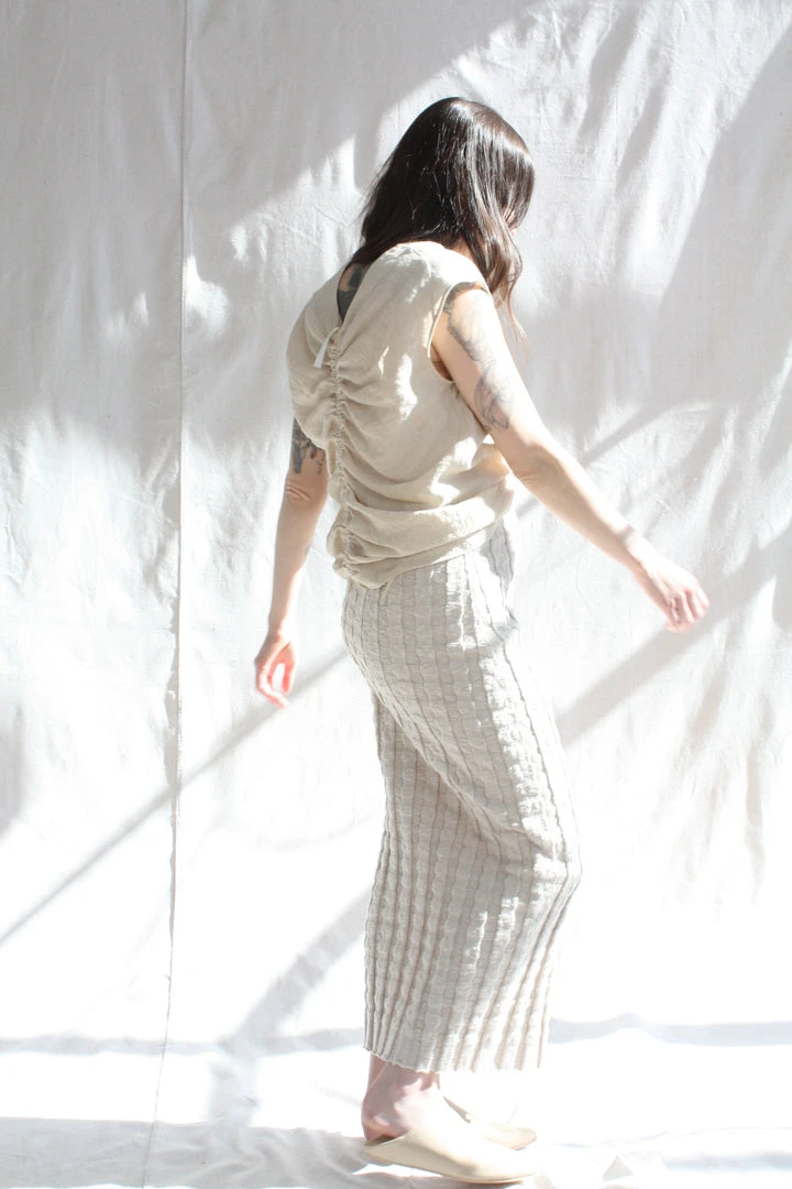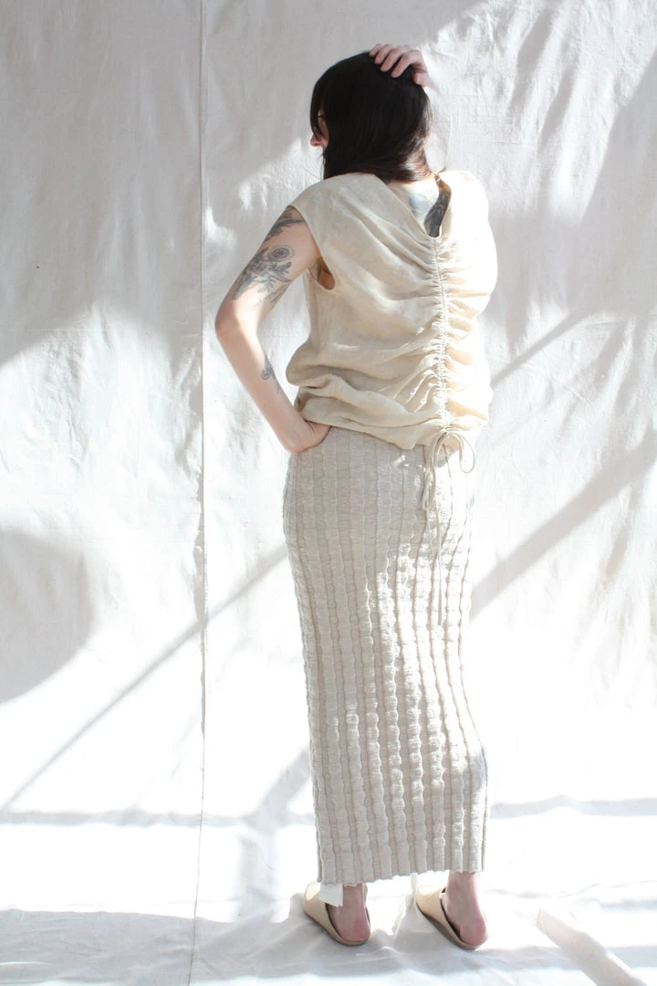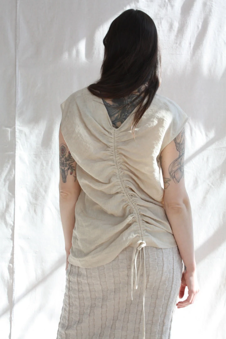 Lightweight linen shell with subtle irregular dye effect. Can be worn both ways with ruche in front or back. Adjustable drawstring for customizable fit.Â
