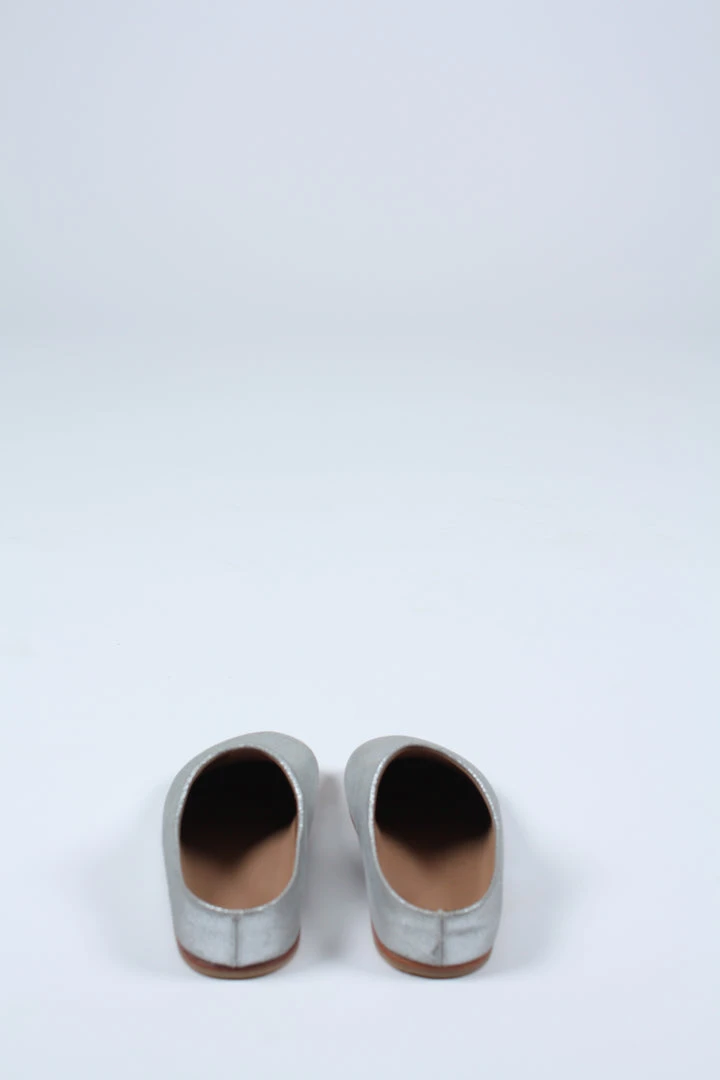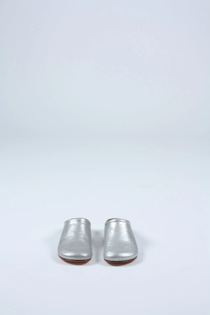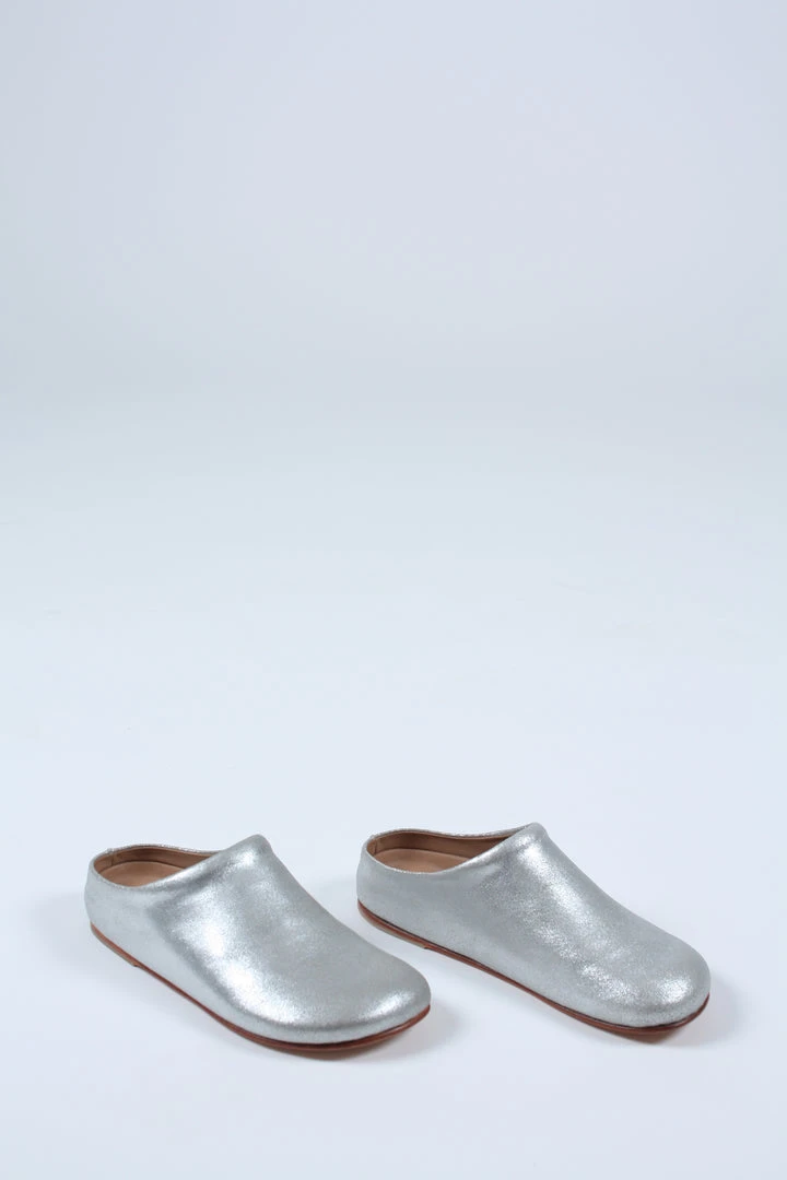 Silver mono mule with stitched sole detailing and interior cork footbed.
