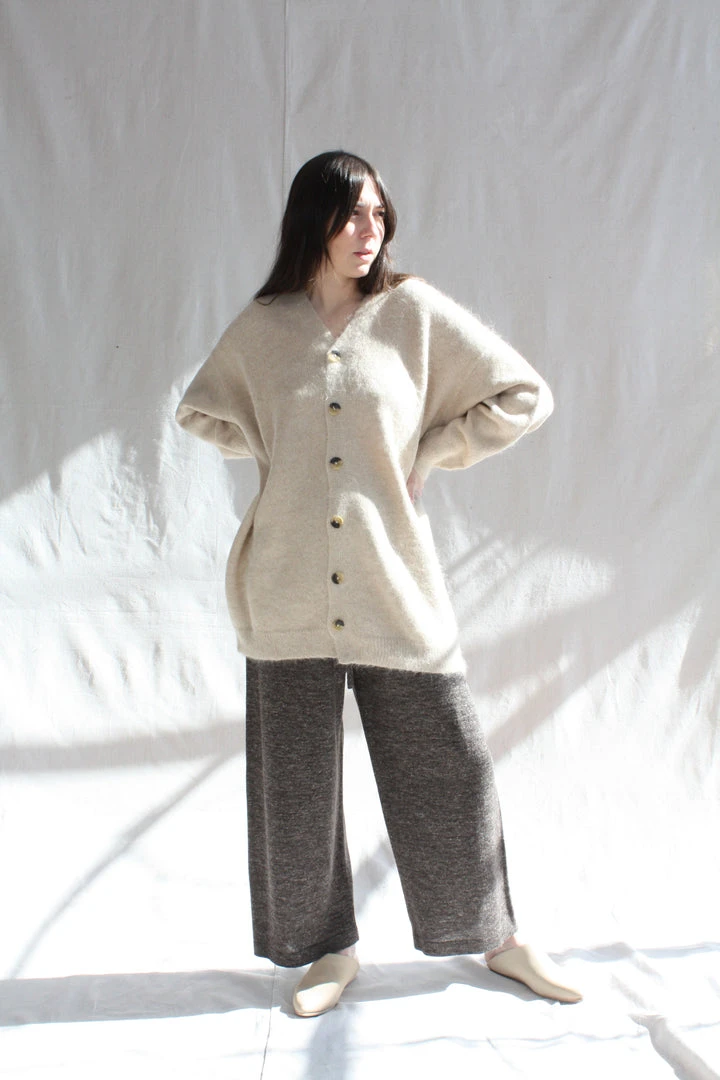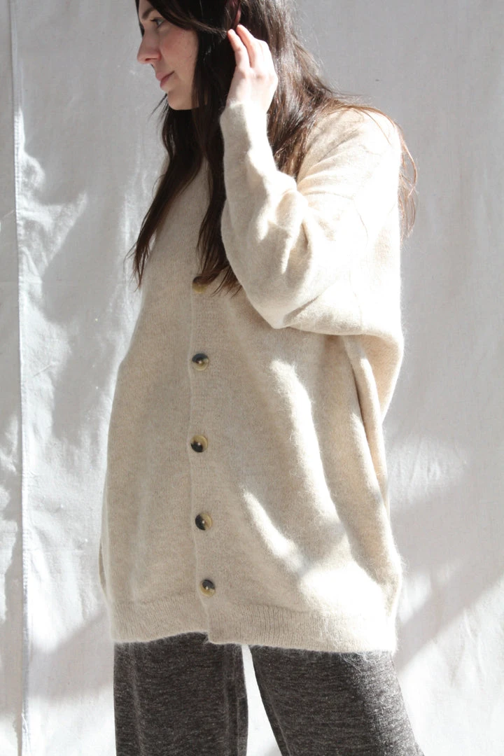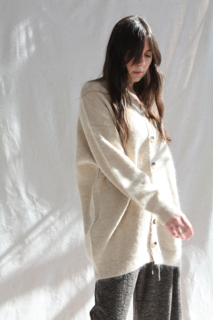 Long over size button cardigan in long fiber Suri Alpaca, with a light brushed texture and soft washed finish.