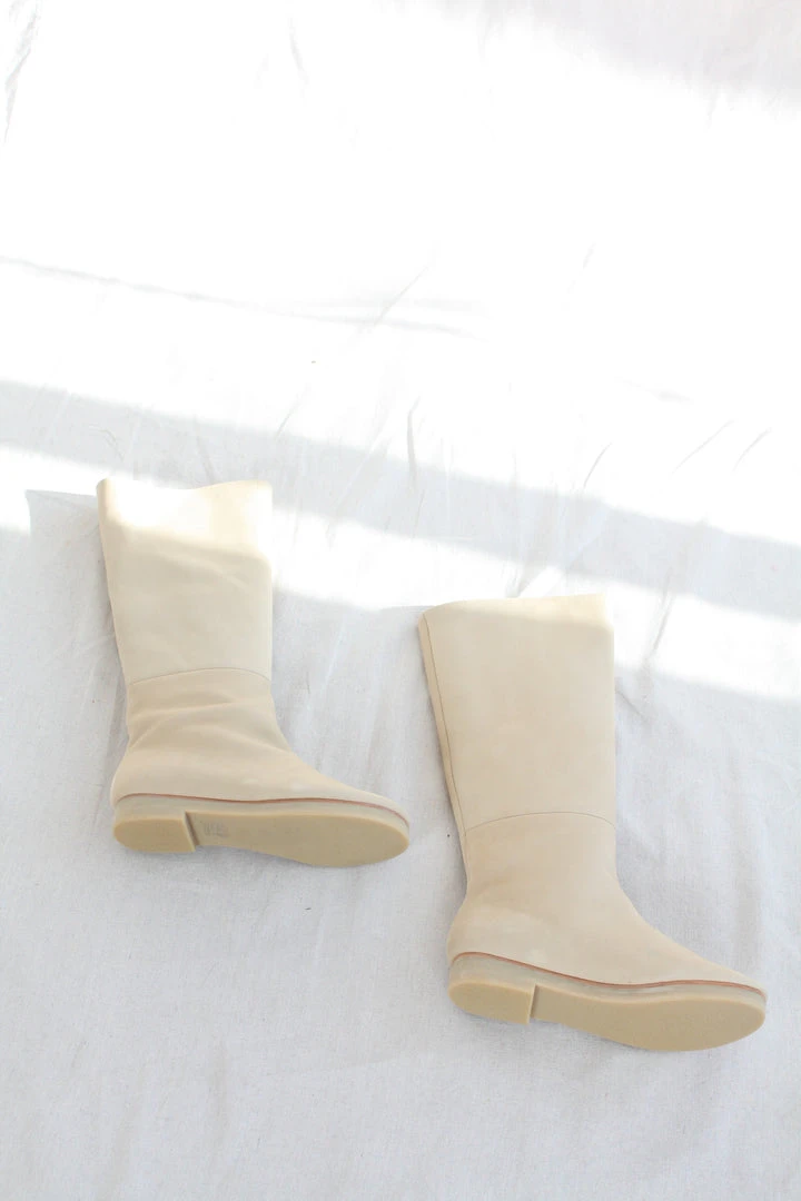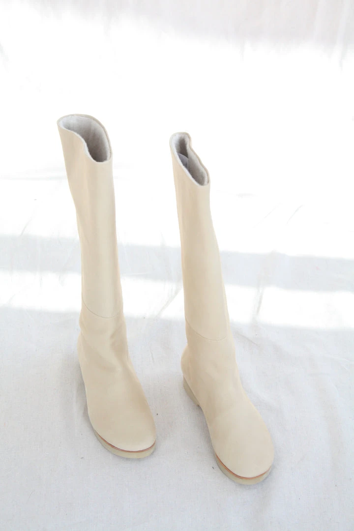 Tall pull on boot. Vegetable tanned leather upper, brushed alpaca liner and natural rubber sole.