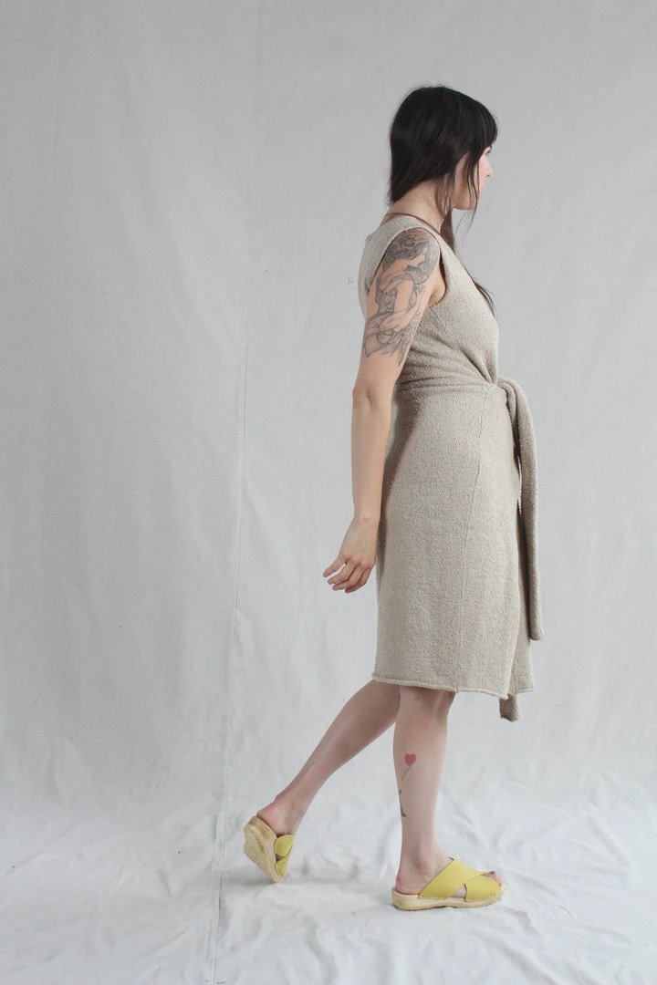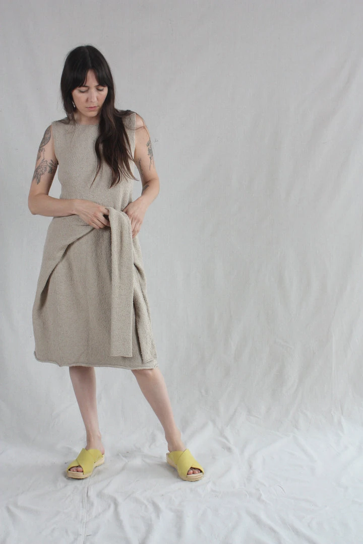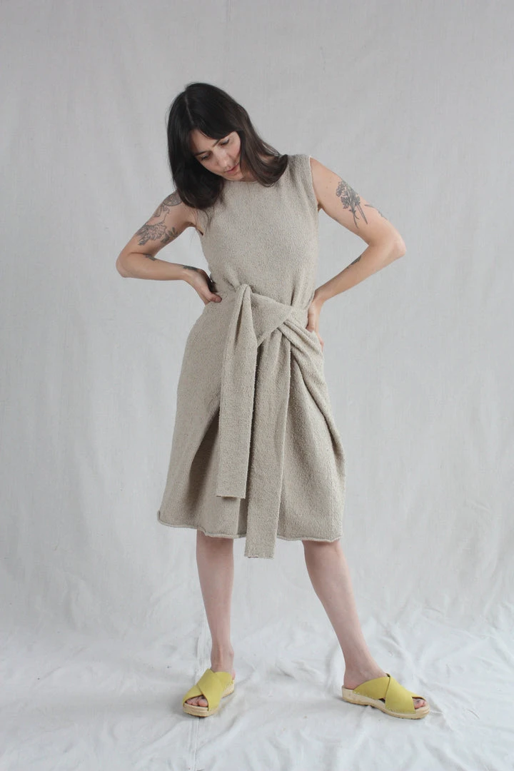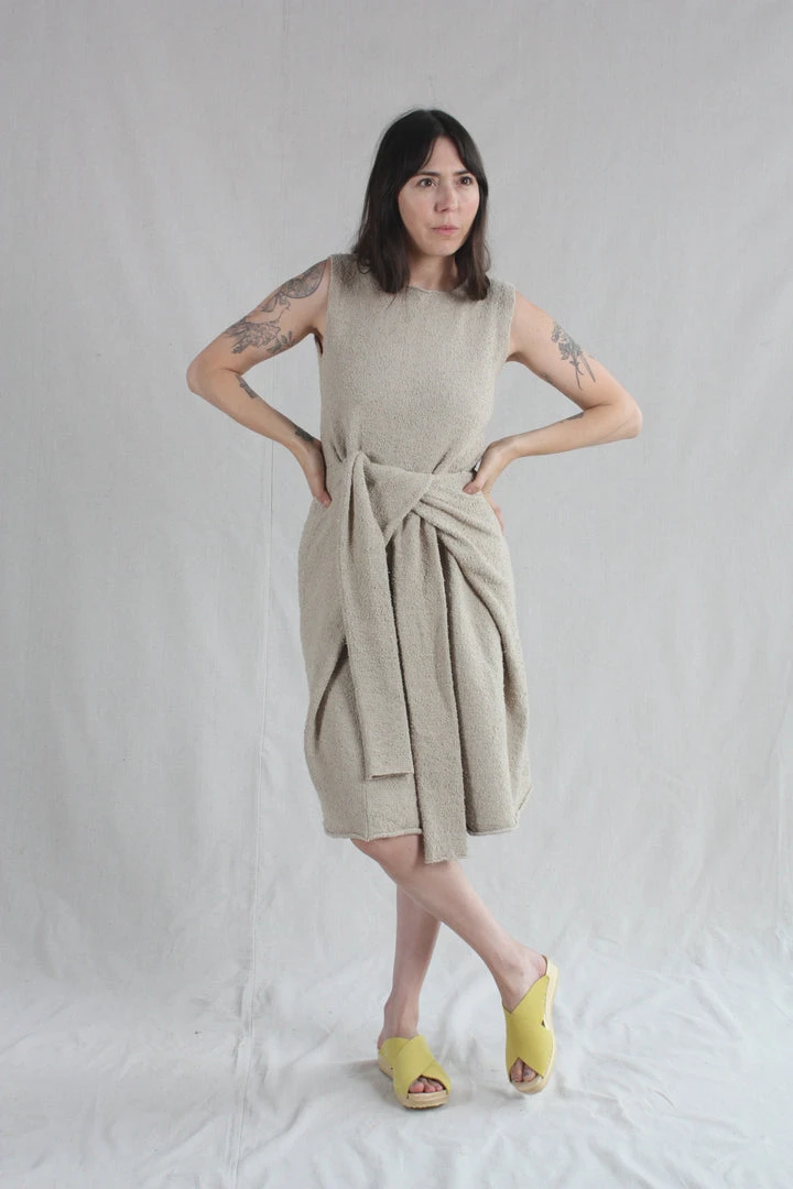 Scoop neck tank dress in a tight textured boucle with lycra for stretch. Adjustable tie panels at waist.Â