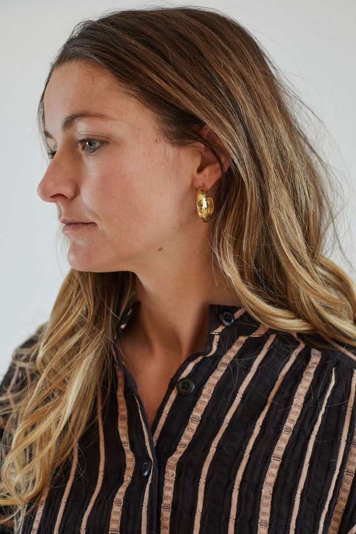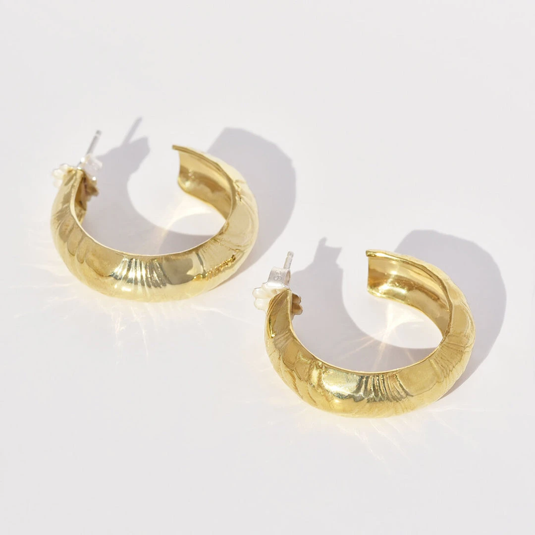 Marbled textures cover the surface of these brass hoops. Inspired by the ancient Turkish paper making technique, Erbu.