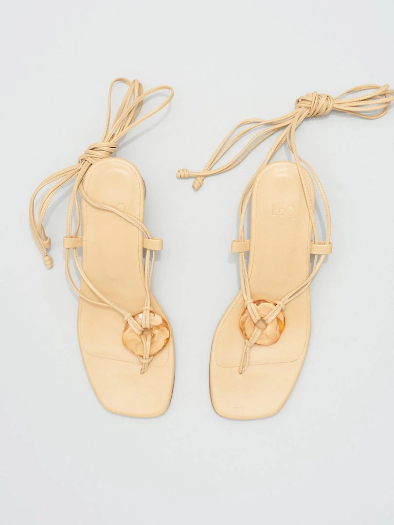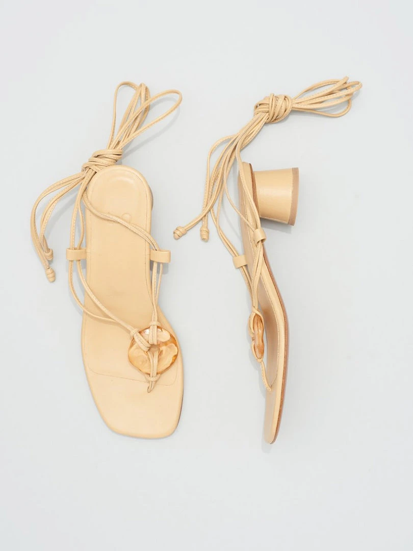 The Cala is a strappy thong sandal with a circular resin ornament at the toe and thin piped leather ties that wrap around the ankle in beige leather.