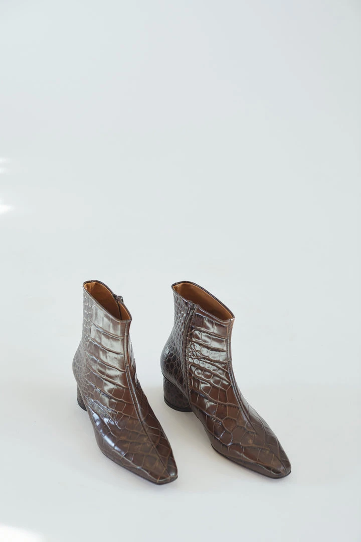 The Matea is an ankle boot in embossed brown leather with an almond toe. Oval heel covered in leather