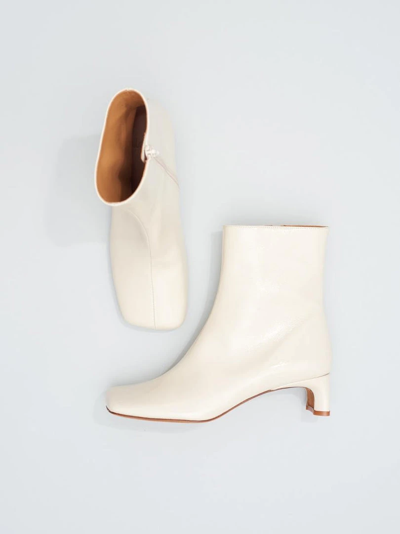 The Monica is a square toe boot in textured white patent leather, featuring a side zipper and distinctive mini-heel.