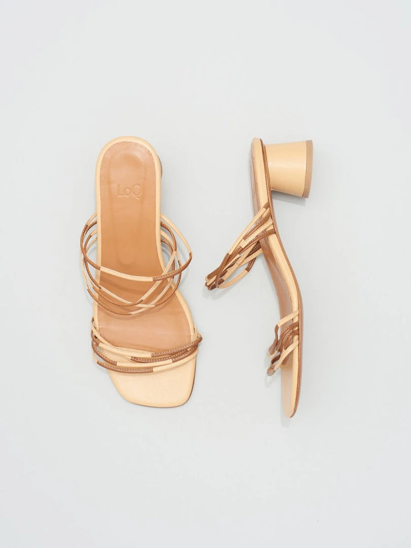 The Juli is a slide style heel with two straps made up of thin leather multiples arranged in a colorblock style of light beige and brown leather.