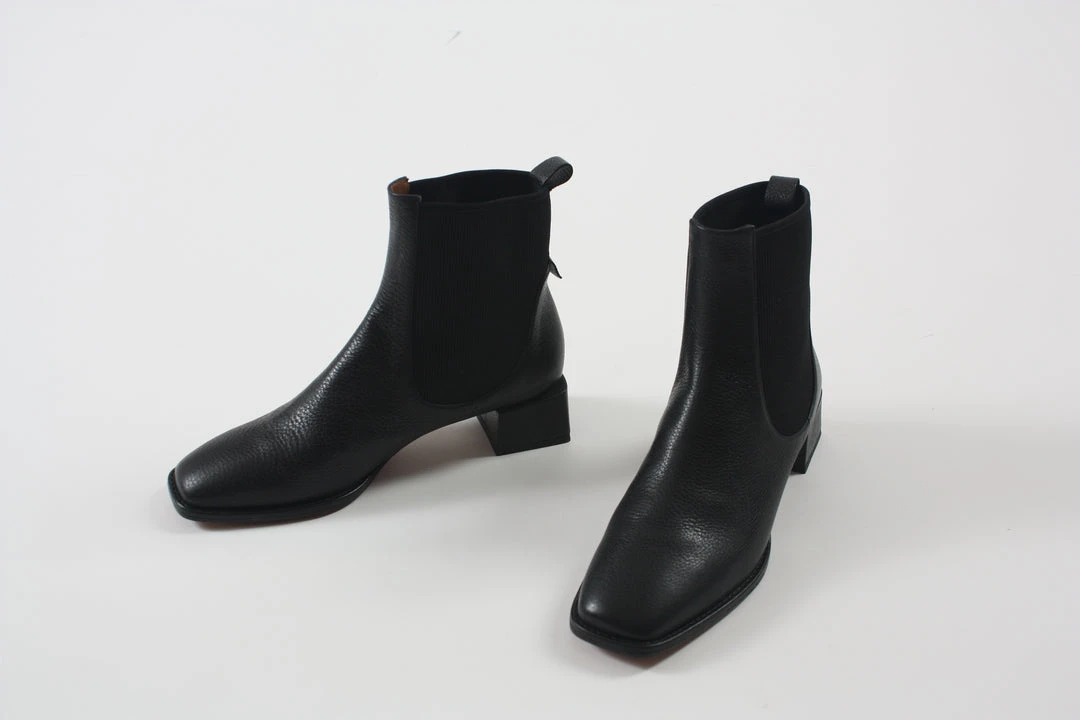 The Ottavia is Loq’s new pull-on chelsea boot featuring a square toe and elastic side panels in classic black leather. Covered block heel. Padded leather footbed and leather sole.