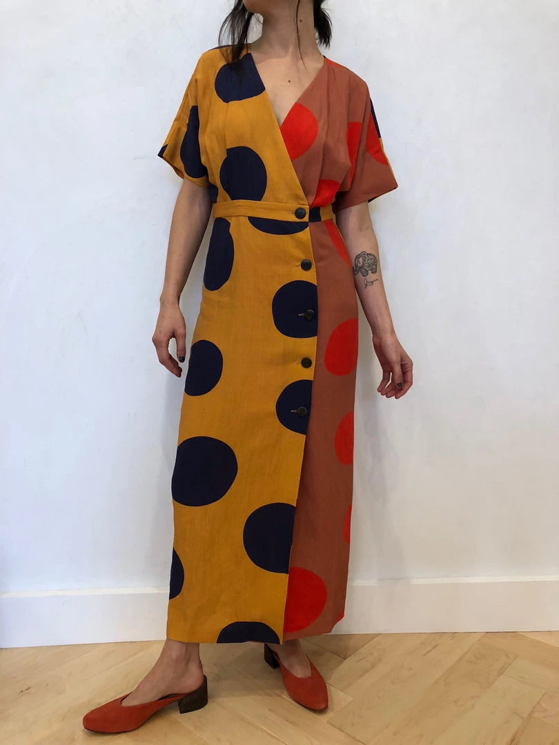 Amrita short sleeve, ankle length dress in navy and mustard penny dot. Five-button closure at front. V-neck with pleating at bust.