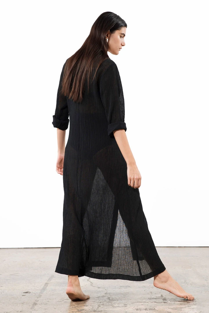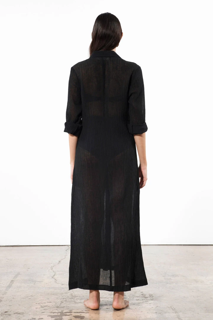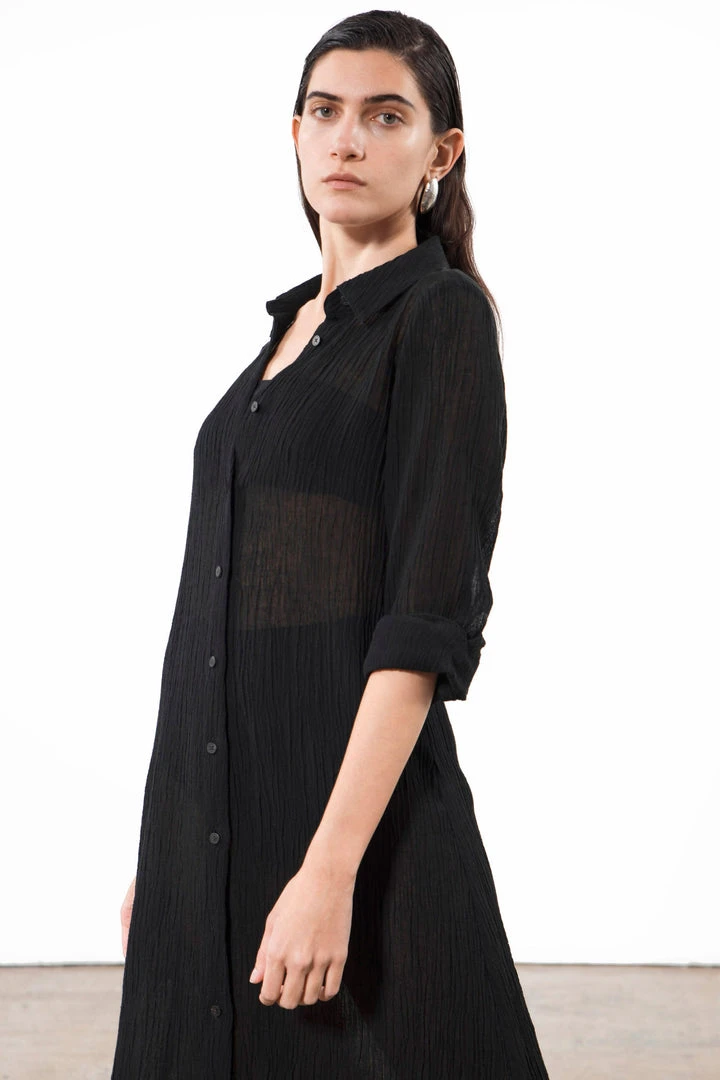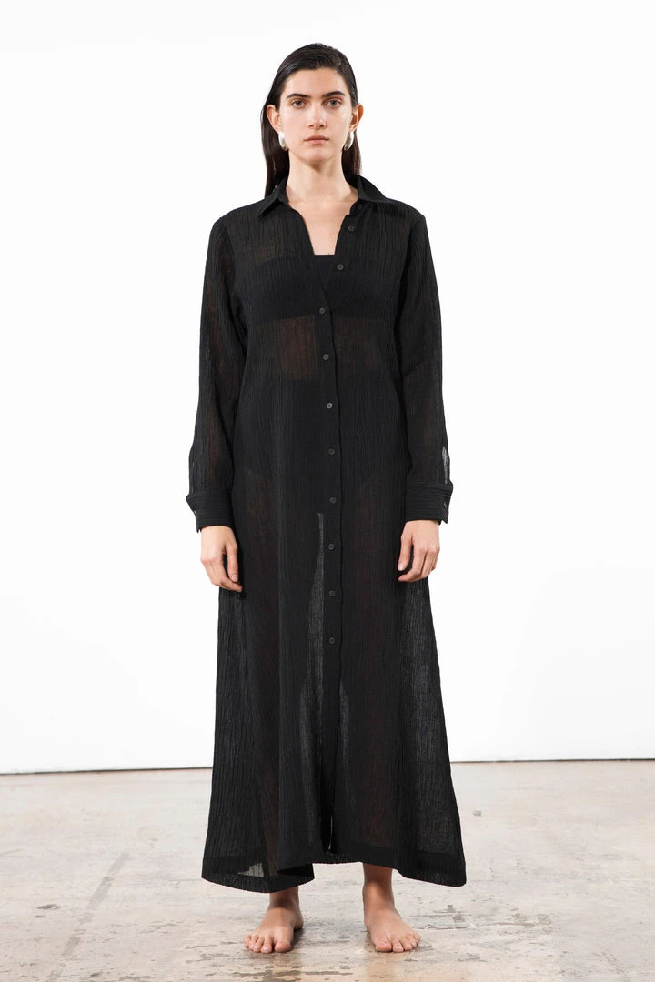 Minimal shirt-style dress with spread collar, buttoned shirt-sleeve plackets, and full front-button placket closure. Soft shoulders, fitted through bodice and waist; A-line skirt cropped at ankle. Unlined. Made from a sheer, lightweight organic cotton linen blend.