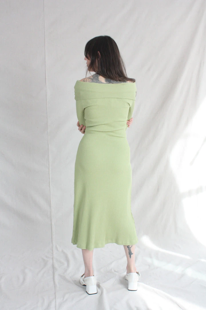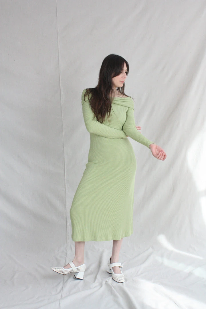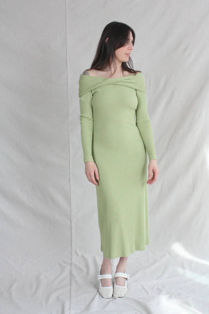 Emery is an unlined, off-the-shoulder dress with a low, flat neckline and a twist detail at the chest. Featuring long sleeves with a fitted body and slightly flared skirt cropped at mid-calf. Made from an extra soft blend of organic cotton, modal, and linen, with spandex for comfort and stretch.
