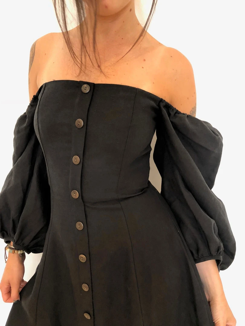 Marlow midi dress in black. Fitted bodice with boning and full 3/4 sleeves, which can be worn on or off the shoulders. Zipper at back. Bodice lined.