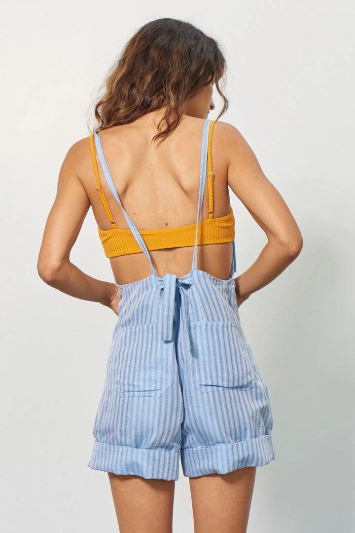 Coverup overalls in blue stripe. Features adjustable tie straps with grommet detail, pockets at front and at back.