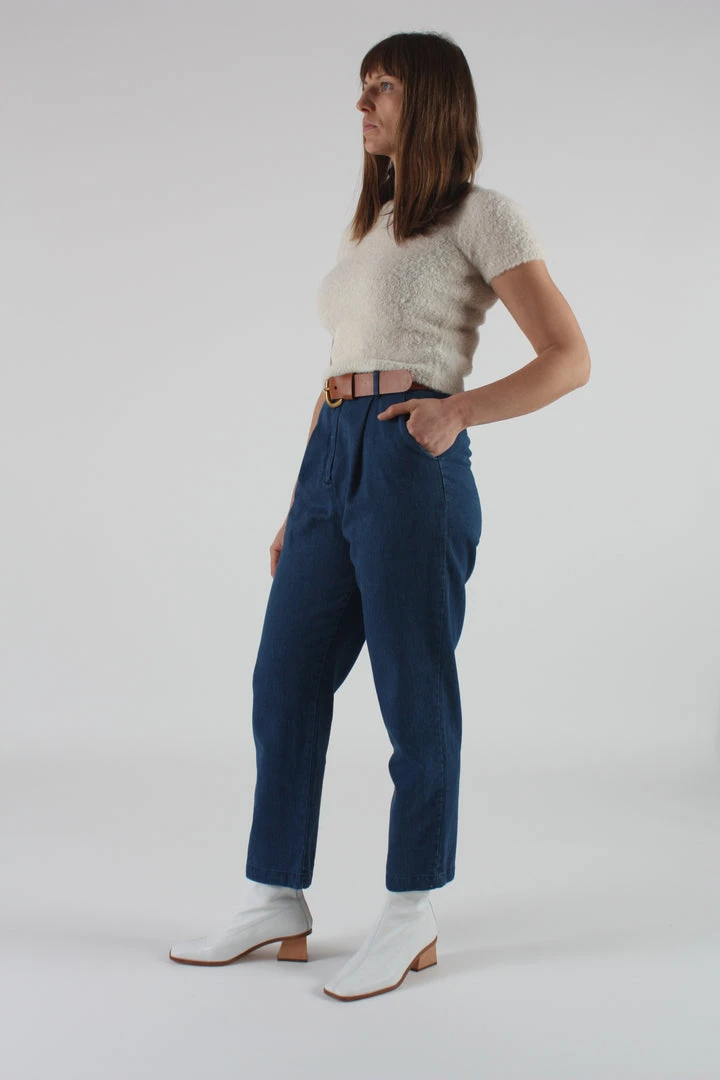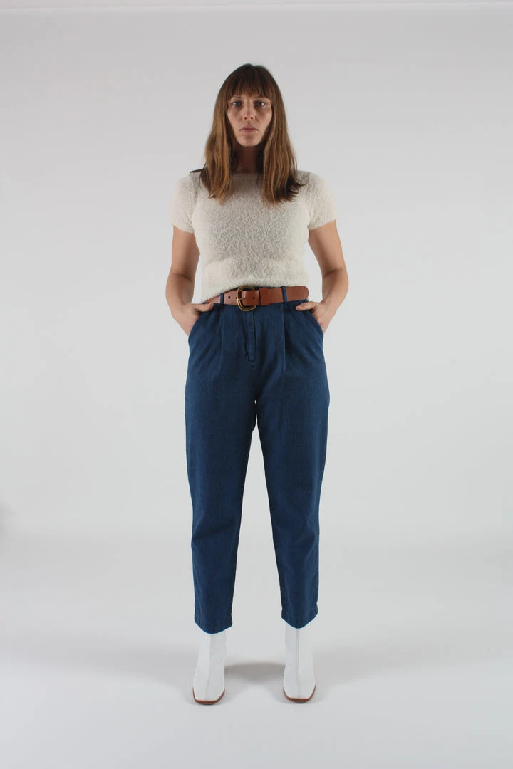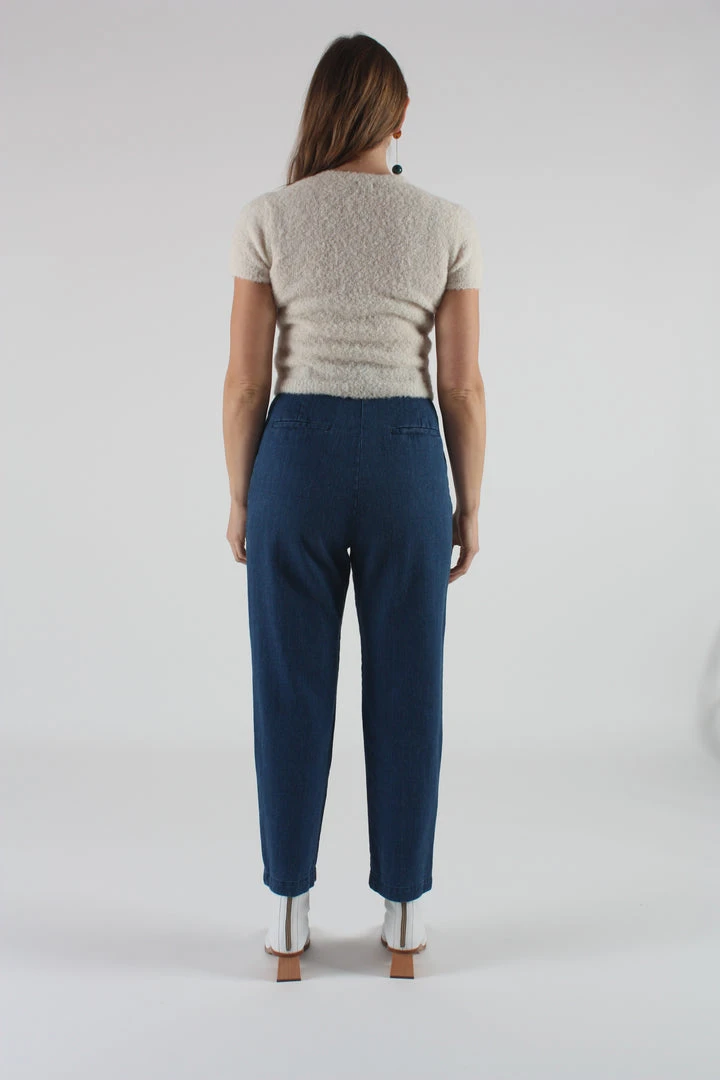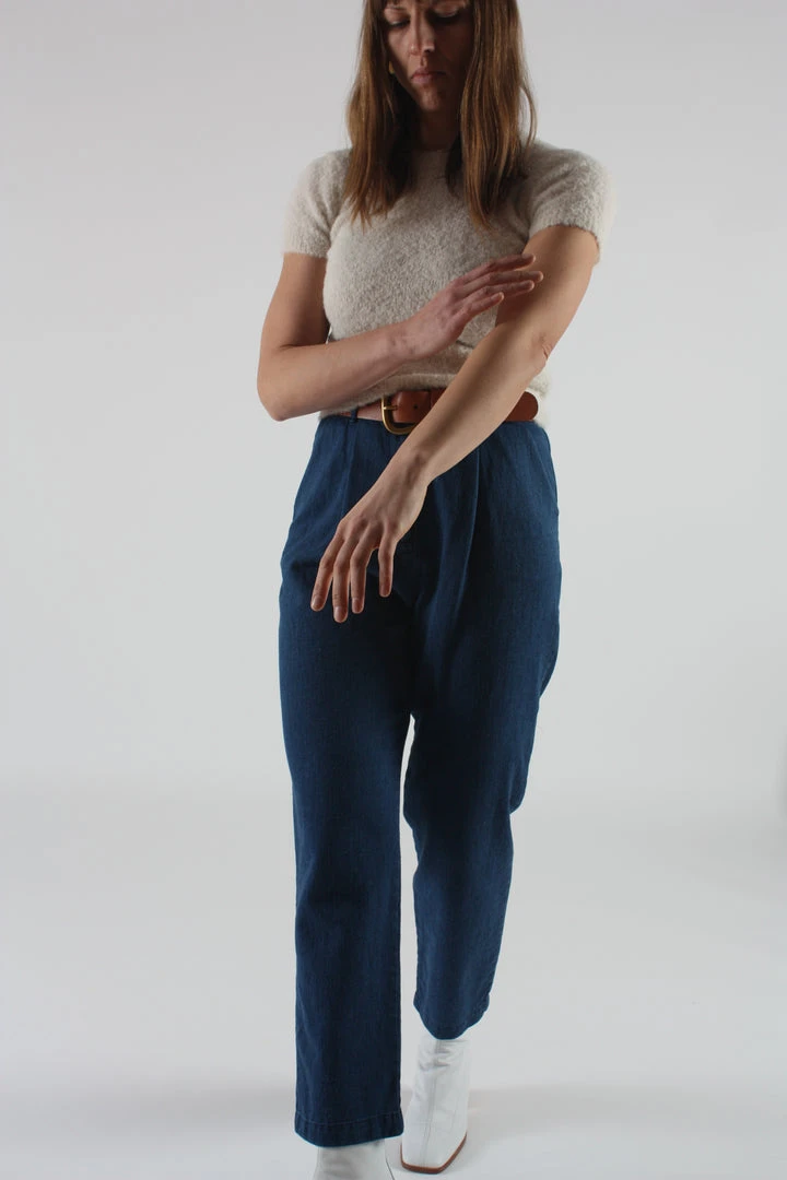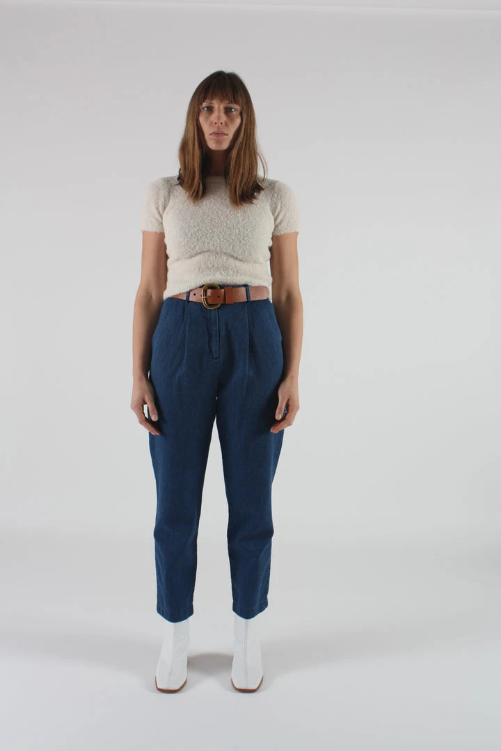 The Jade high waisted pant in washed blue denim. Pleated at front. Side and back pockets. Belt loops. Tapered leg. Button fly.