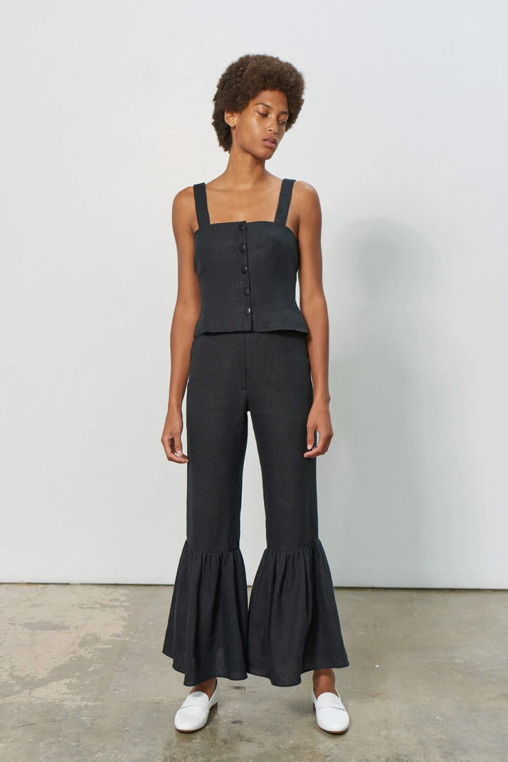 Piper cropped flared pant in black. Front zipper with button closure. This pant is made of 100% hemp, which is one of the most sustainable fabrics. This fabric will only get better over time!