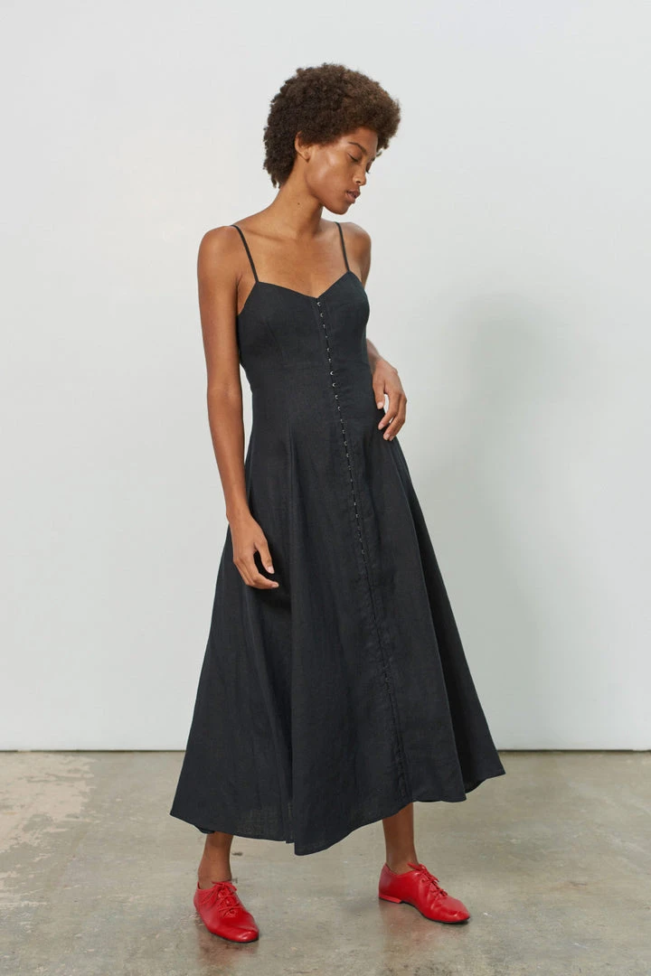 Midi dress in black. Features fitted bodice with princess seams and hook and eye closures at front. Straps constructed to allow for optional tailoring. This dress is made of 100% hemp, which is one of the most sustainable fabrics. This fabric will only get better over time!