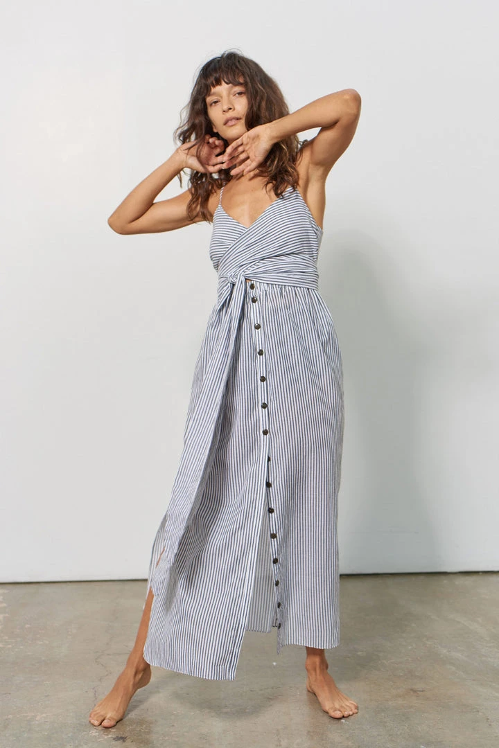 Wrap top dress in black and white stripe. Features button up skirt, adjustable spaghetti straps and side slits to mid thigh. Elastic waistband. Semi-sheer.