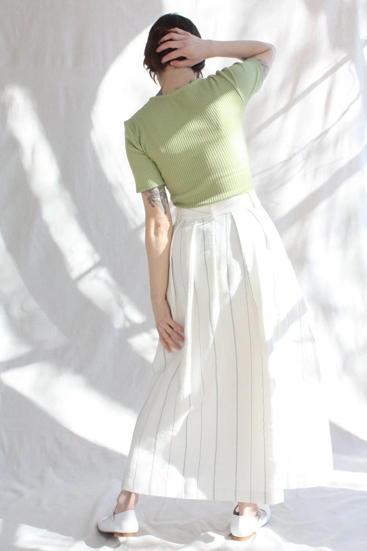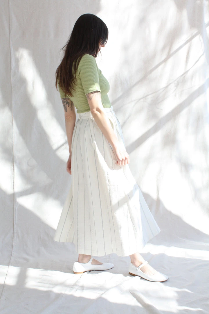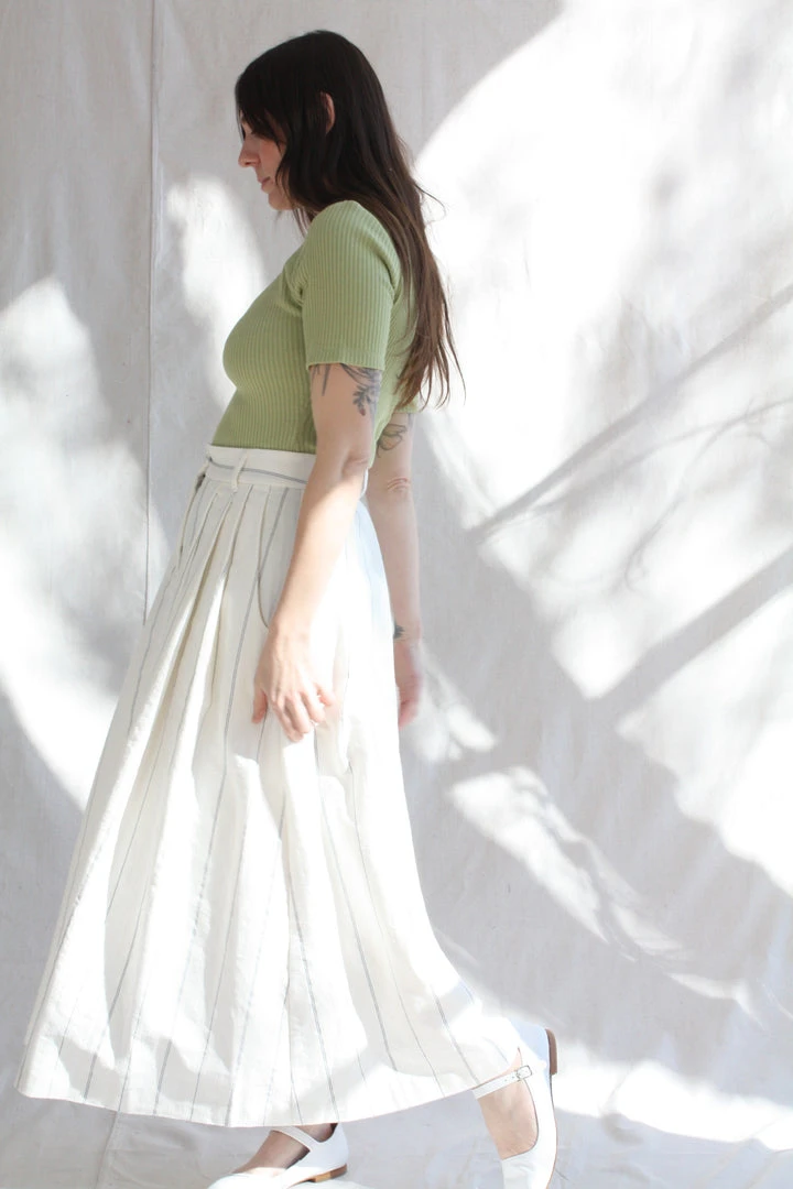 Tulay is a pleated, A-line skirt with a fitted waist, cropped at the ankle. The skirt is unlined and features side slash pockets, functional belt loops and front zipper fly with button closure. Made from a blend of organic cotton and linen in our Polson Stripe print.