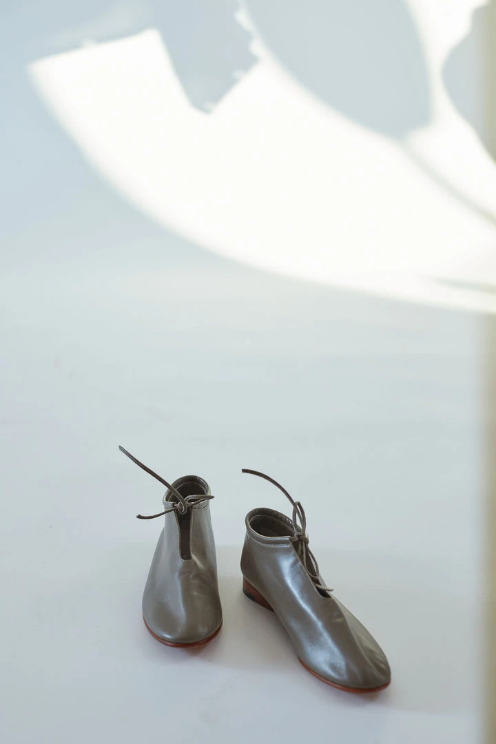 Handmade kidskin leather booties that fit the foot like a glove. Rounded toe and keyhole tie closure. Low stacked heel.Â