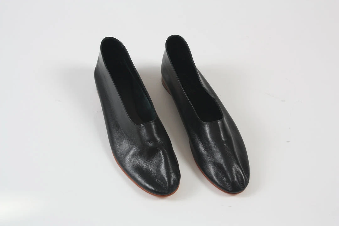 Handmade slip-on flats in soft kidskin leather that fit like a glove. Rounded toe and low stacked heel.