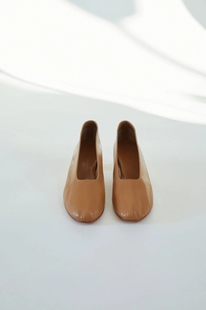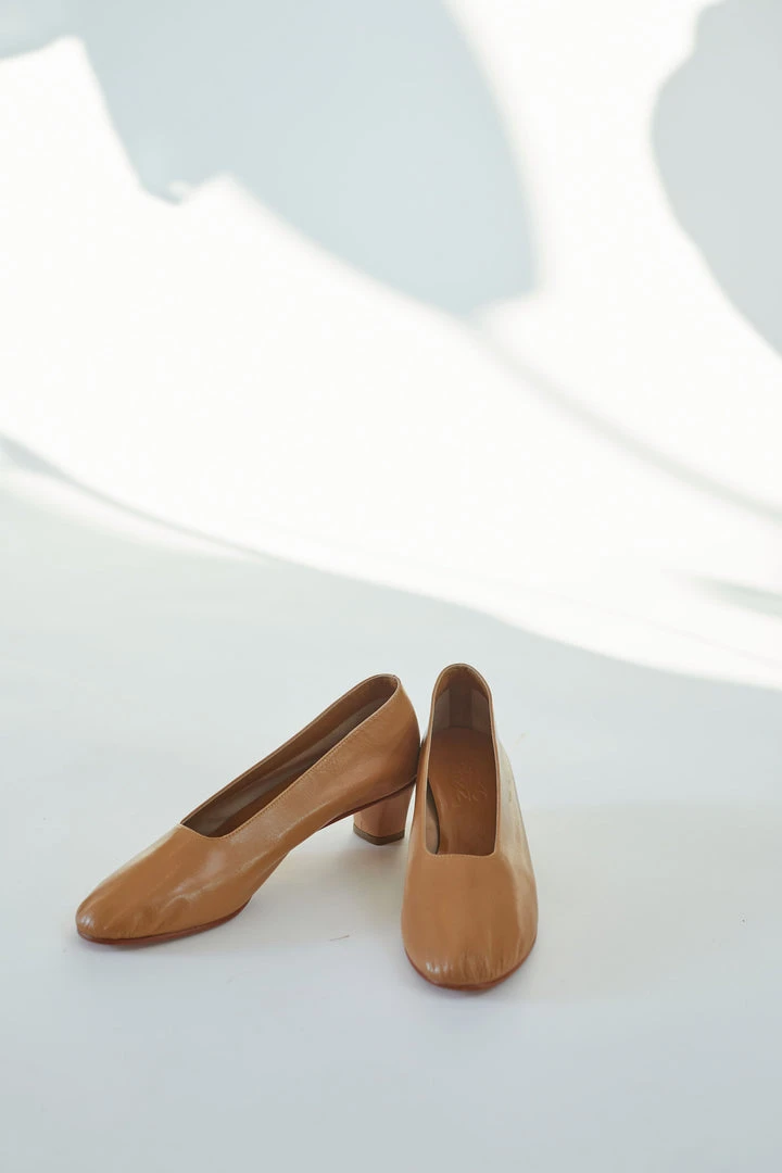 Handmade heels in soft kidskin leather that fit the foot like a glove. Rounded toe and  leather covered heel.
