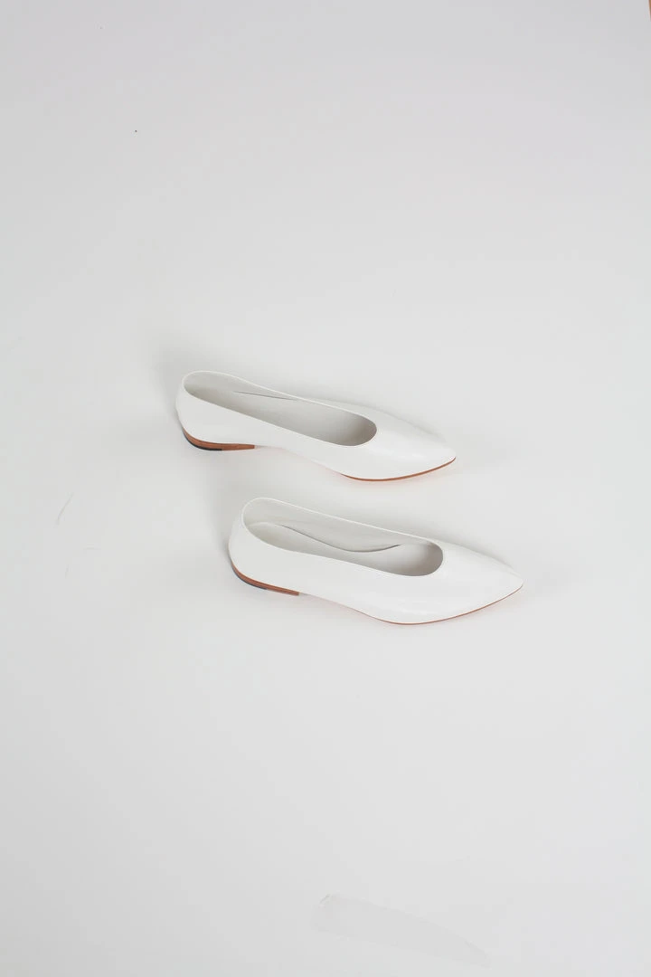 Handmade slip-on flats in soft kidskin leather that fit like a glove. Pointed toe and low stacked heel.
