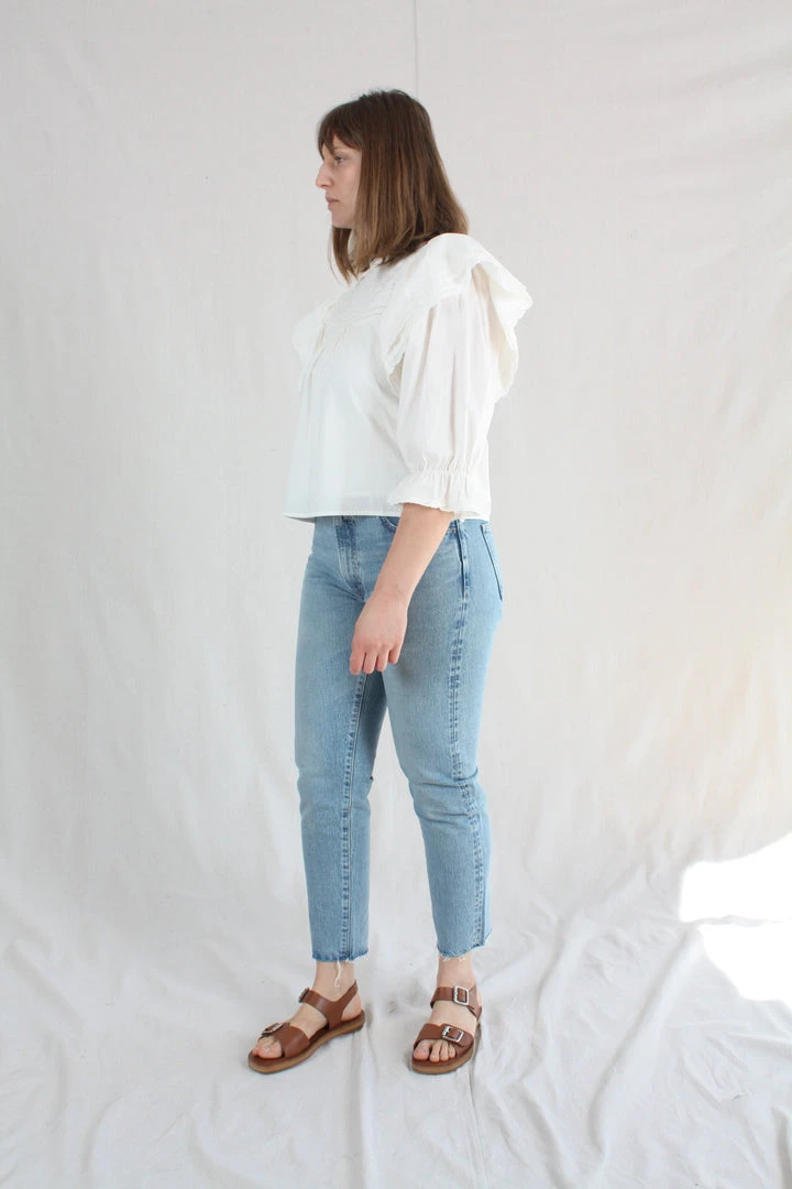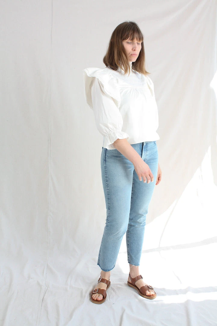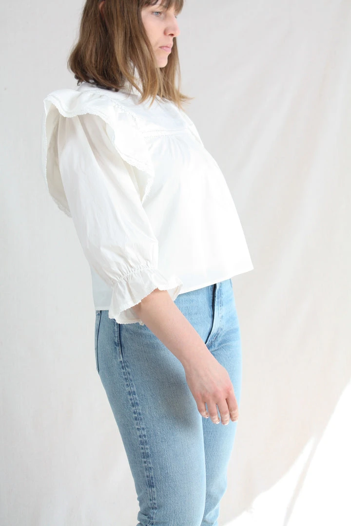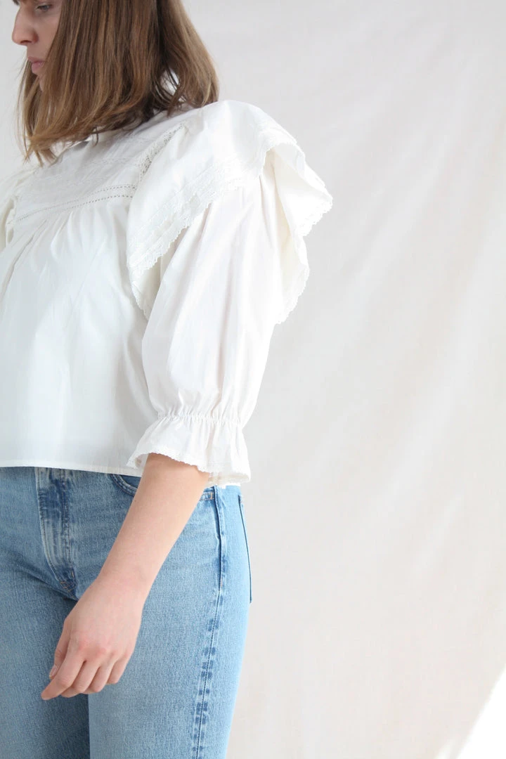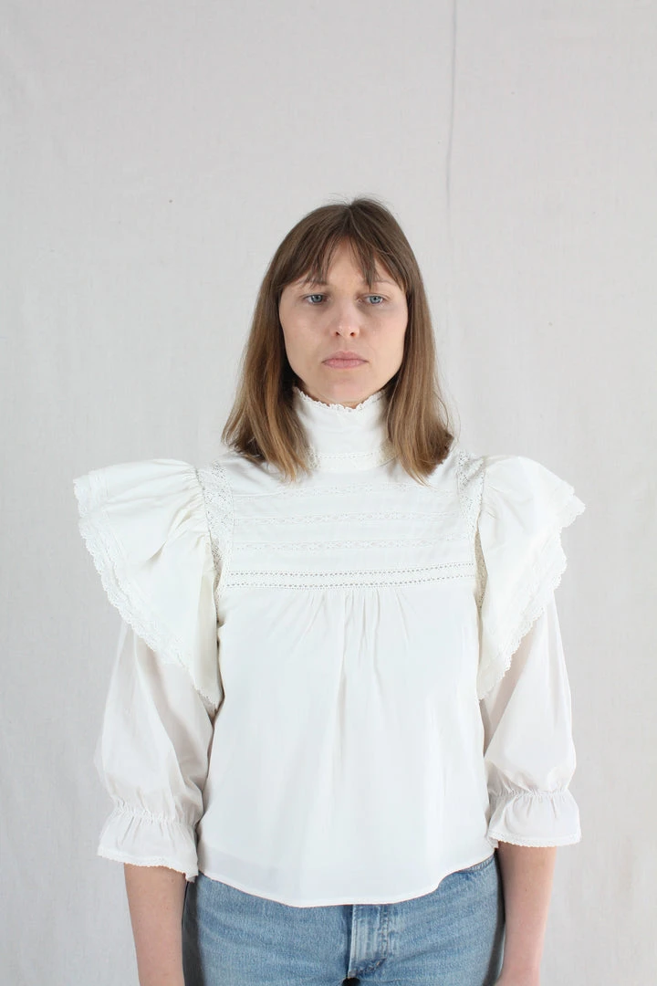 Straight cut shirt with a high pleated neck fastened with a button at the back. With 3/4 length sleeves and an elasticated cuff. With lace detailing throughout.