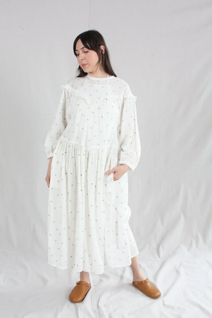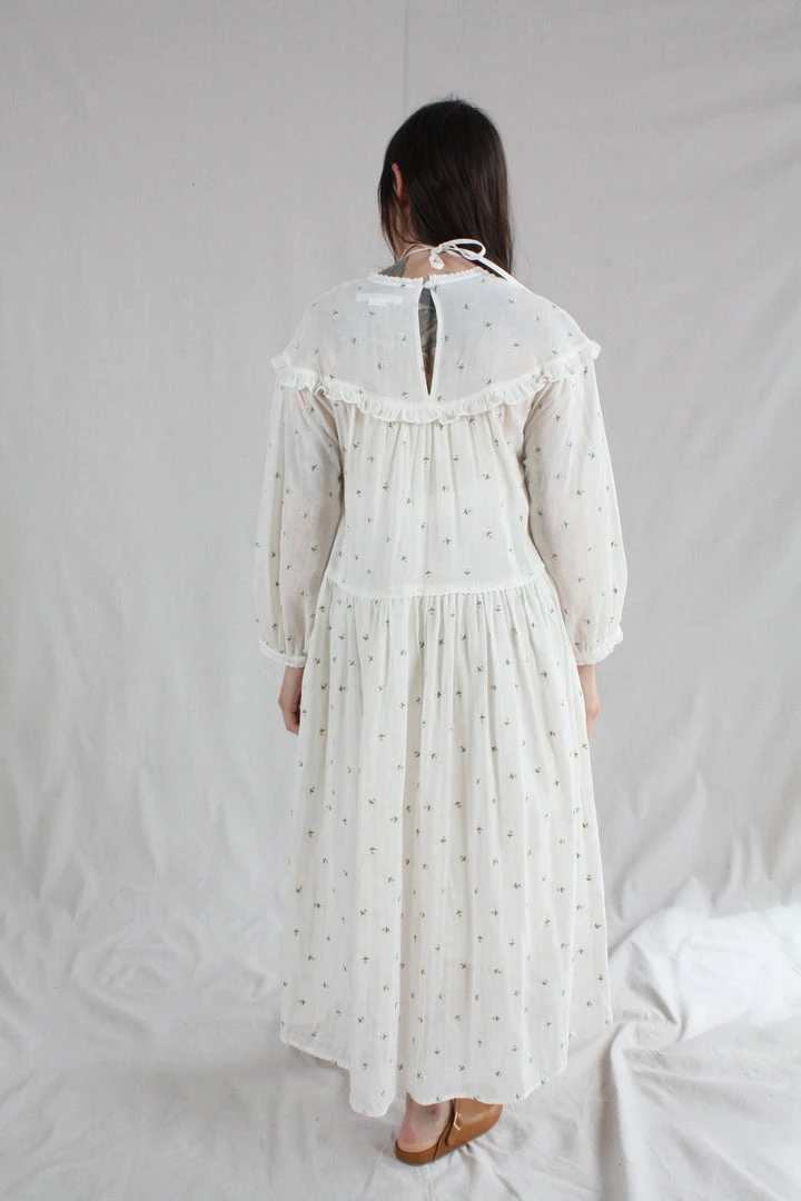 Knee length loose fitting dress with a round neckline fastened with a button at the back. With long sleeves and an elasticated cuff. In our Daisy Embroidery print on a white base.