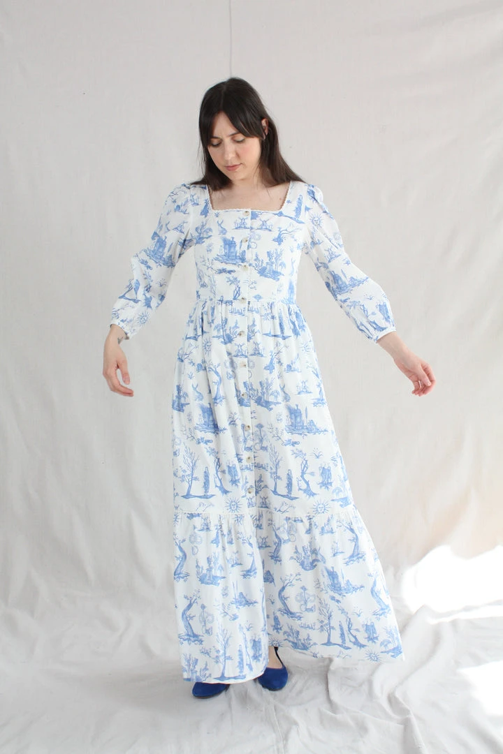 Maxi dress with a square neckline and buttons down the front. With 3/4 length sleeves. Gathered at the waist to create a full skirt.