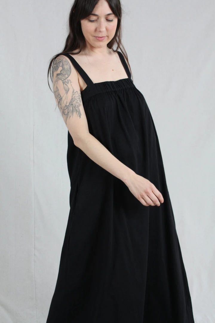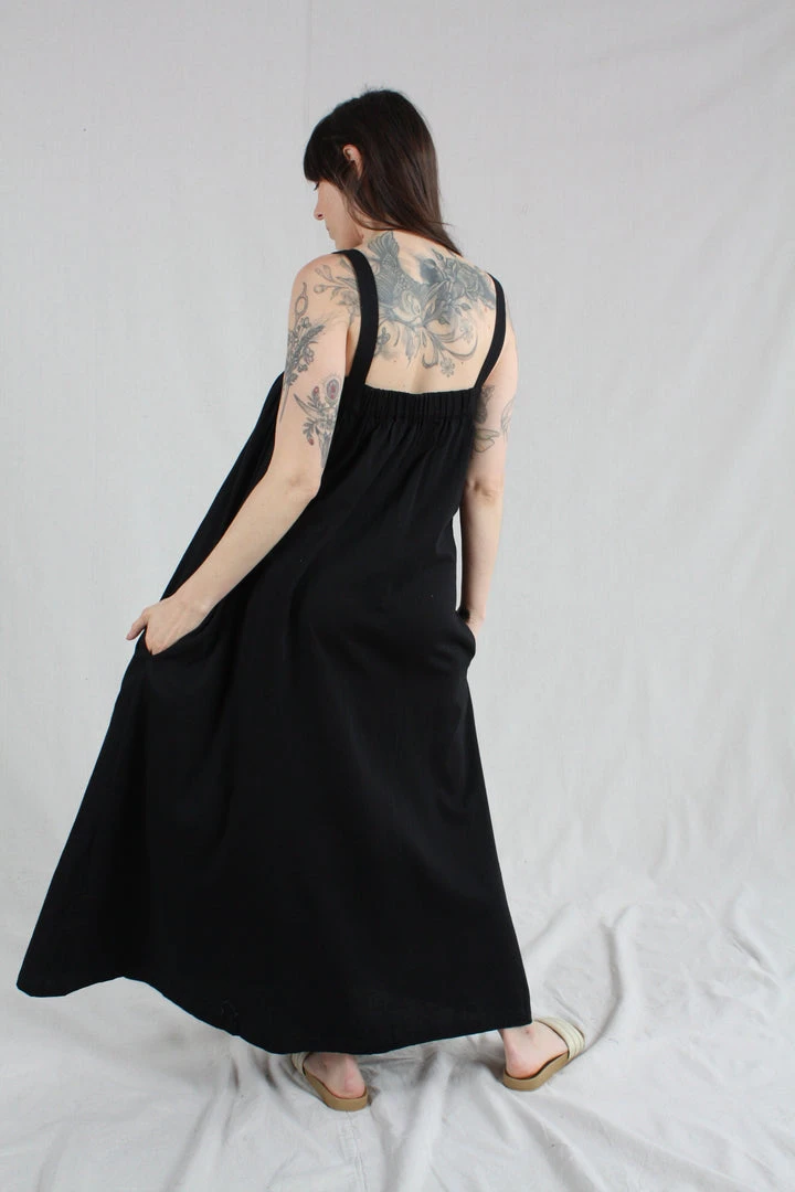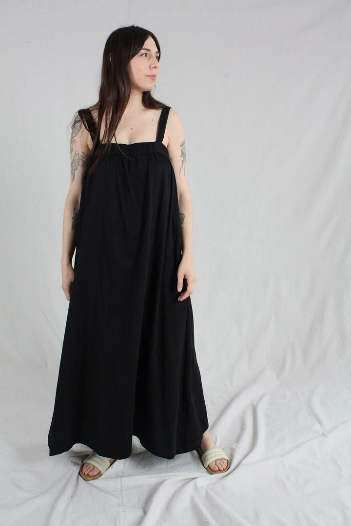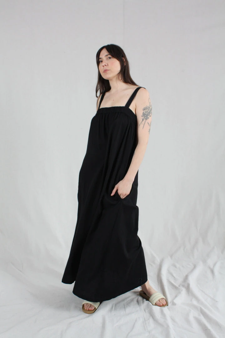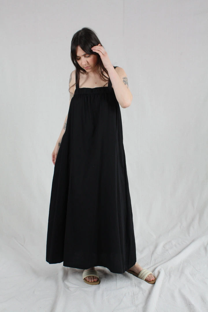 Maxi length tank dress with wide straps and elastic gather detail at the front and back giving a beautiful drape and easy fit.