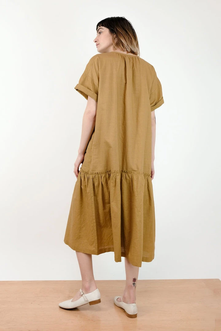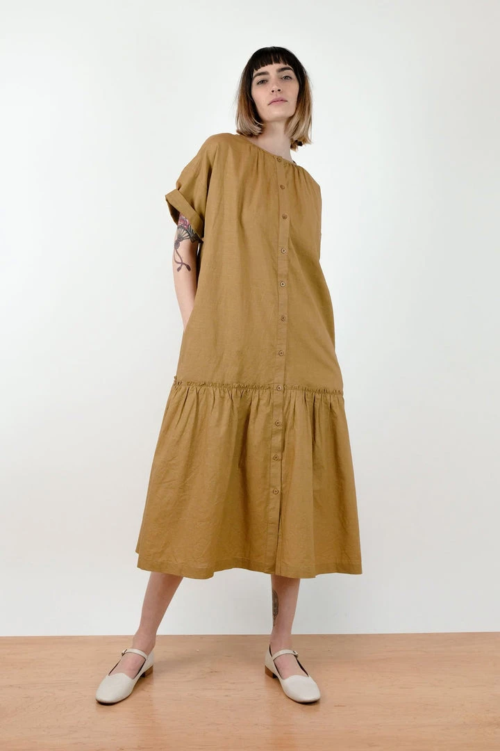 A feminine take on the classic shirt dress featuring a gathered neckline and flounce. The Cleo is the summer dress that can go anywhere, and yes, it has pockets!