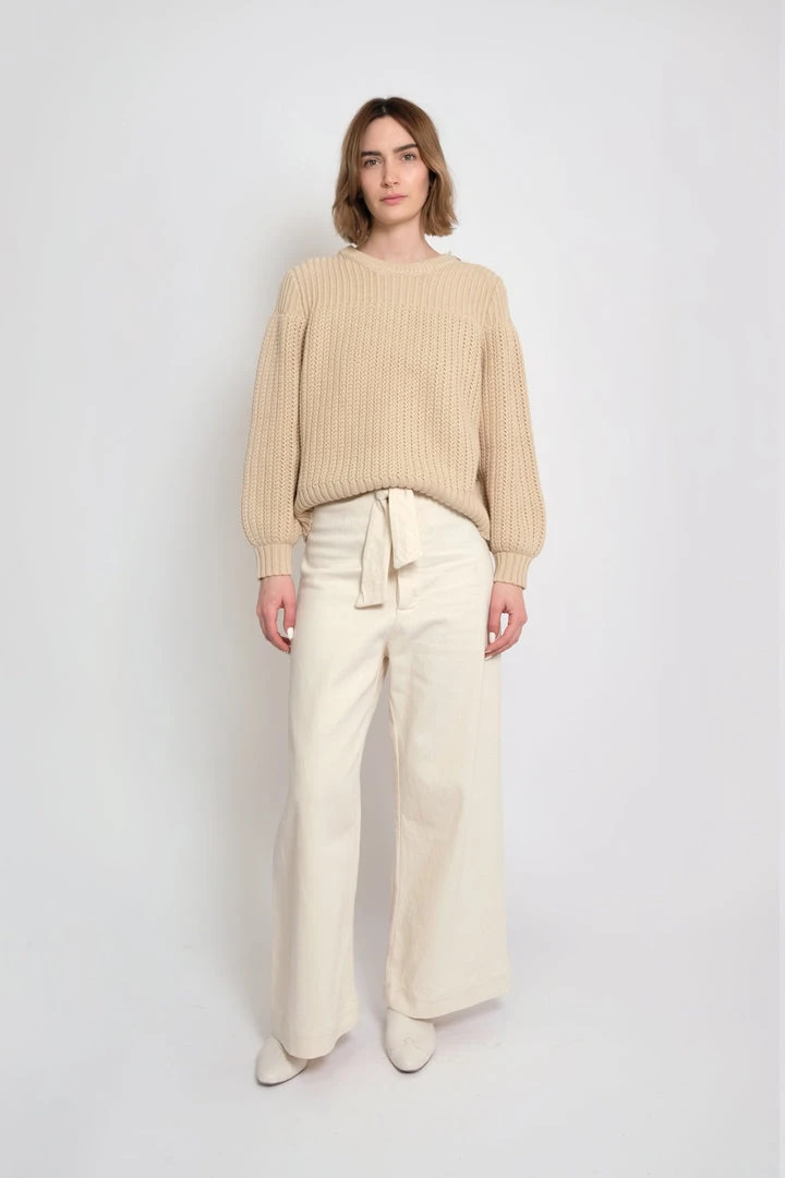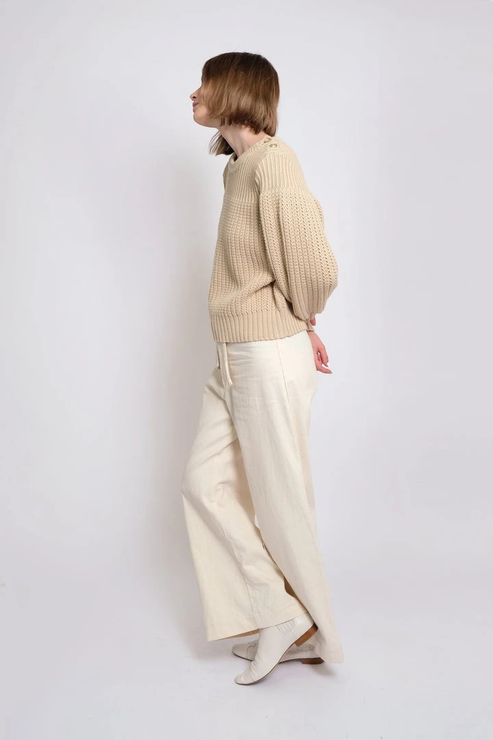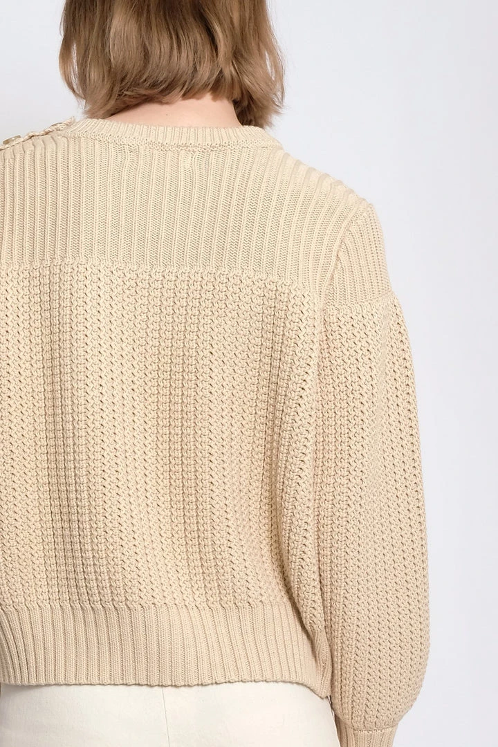 The perfect weight textured sweater with rib detail at top and button placket at left shoulder.
