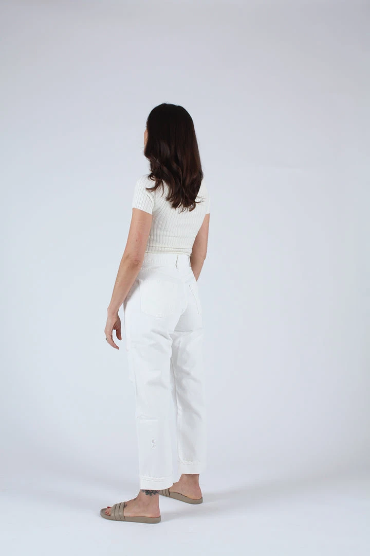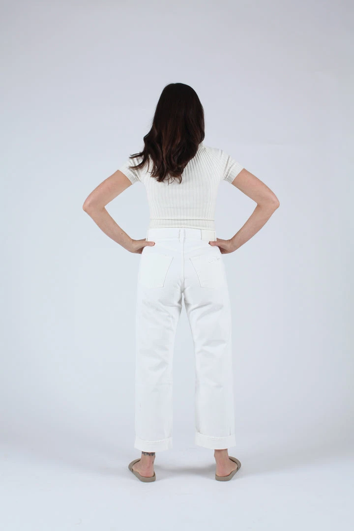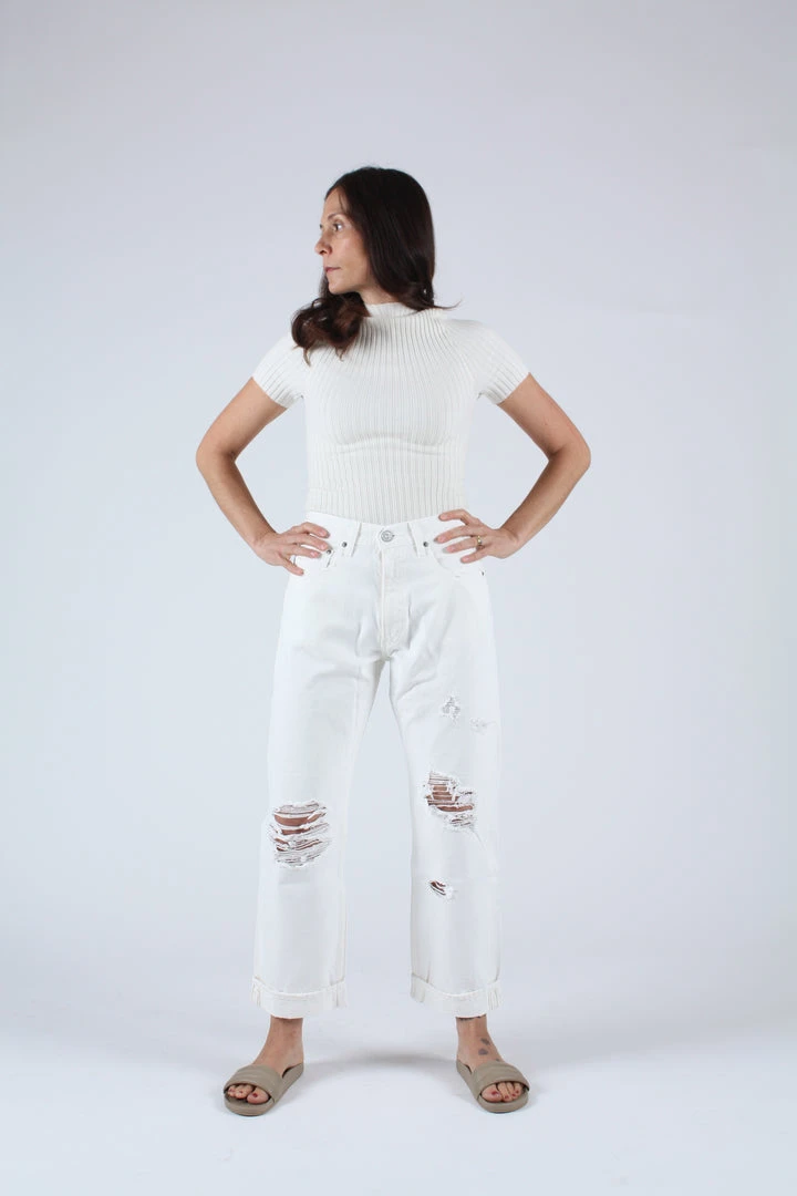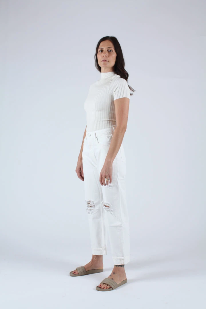 High waisted cuffed straight leg in white. Distressed front and button fly.