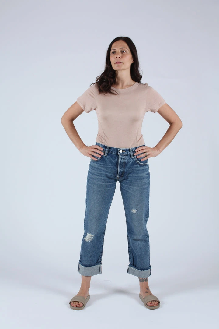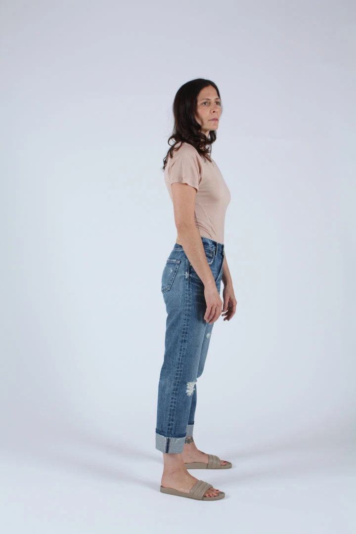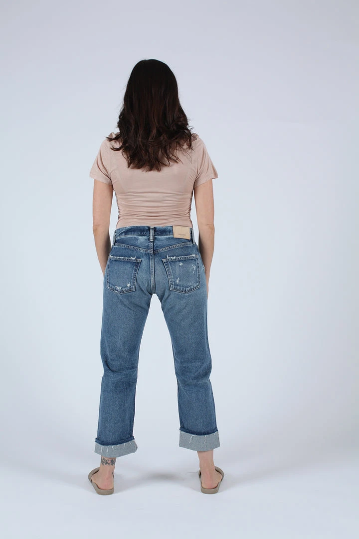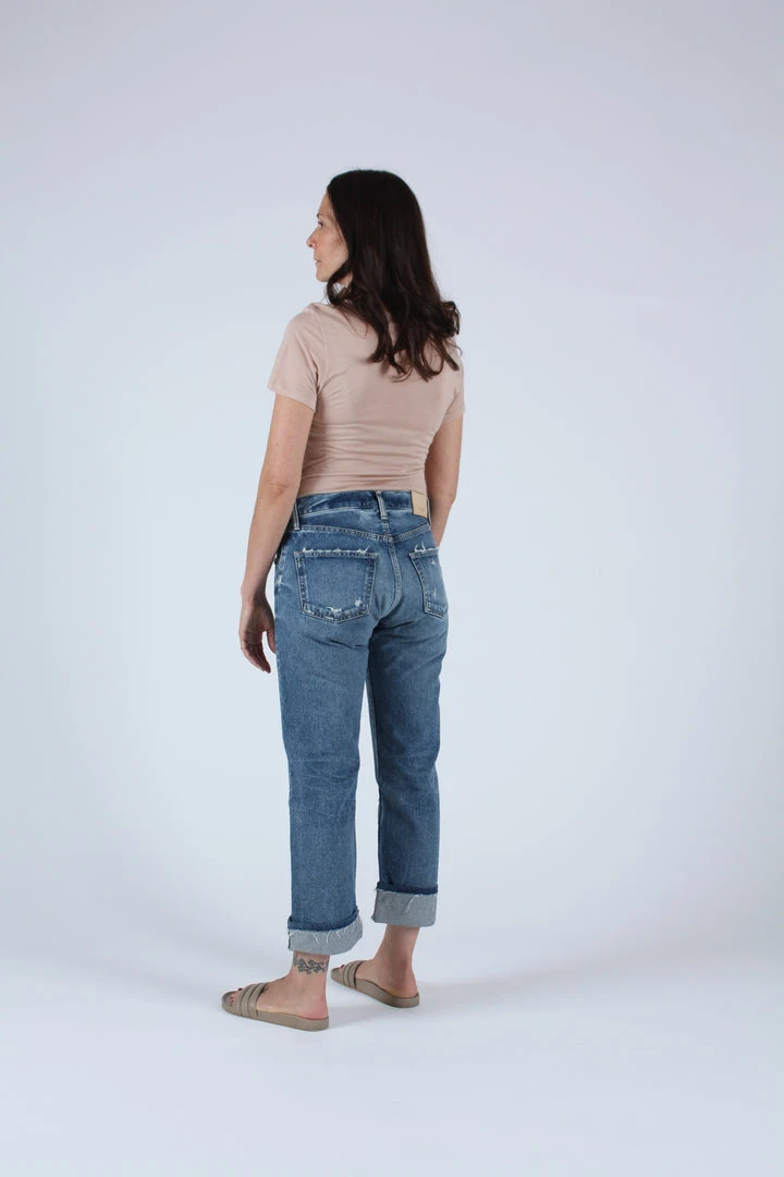 Mid rise cropped straight jean in a dark blue wash with light distressing and cuffs.Â