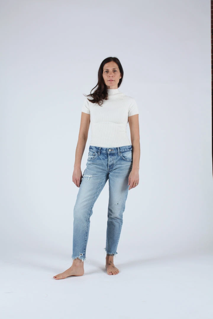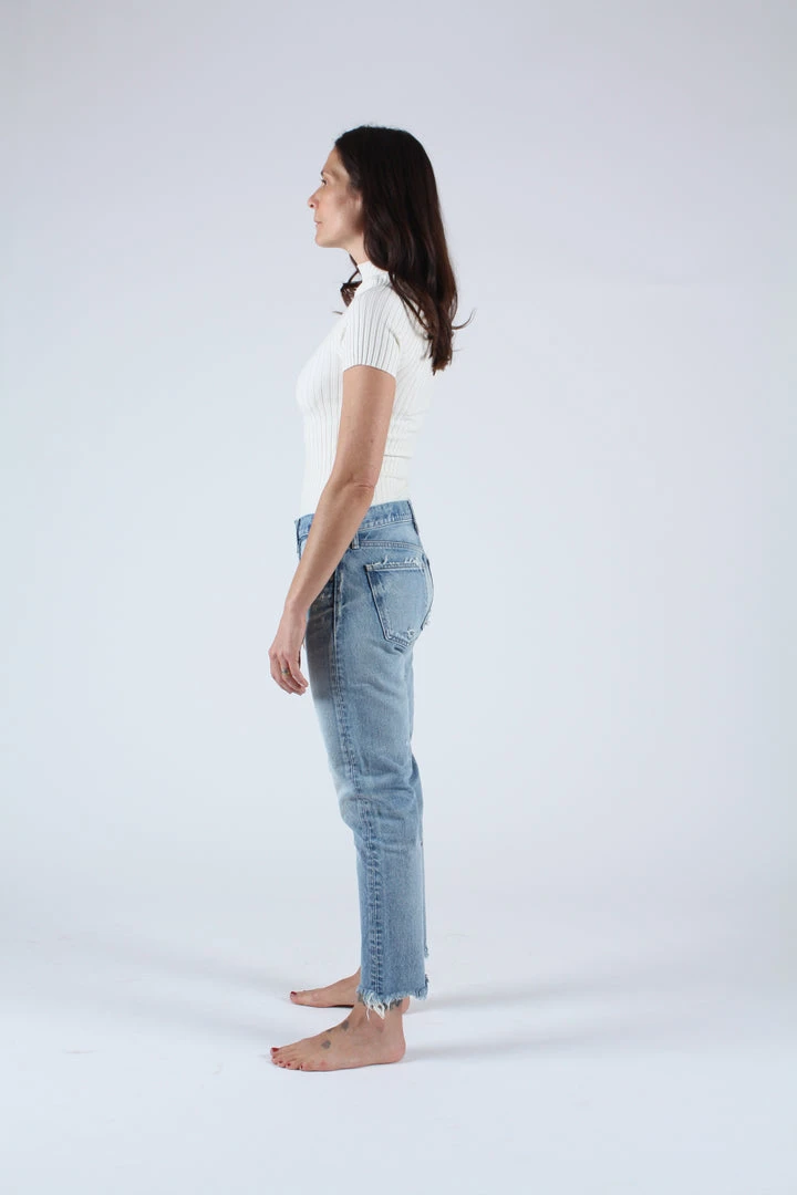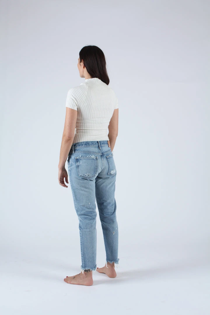 Mid rise cropped tapered jean in a light blue wash. Â Raw hem and distressing.